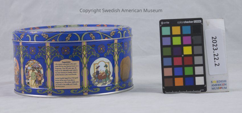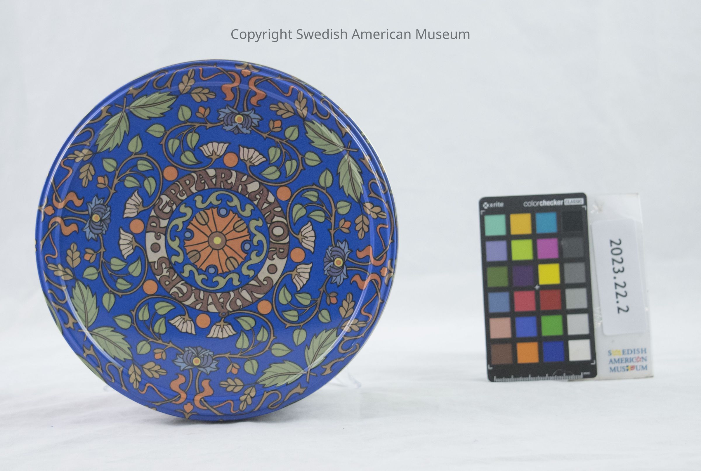 Small blue tin for pepparkakor (Swedish spiced cookies or gingersnaps), made by AB Nyåkers Pepparkakor. Lid bears floral designs and a circle with the words. The bottom is unadorned except for nutritional information in English, Swedish, and German.Acquisition