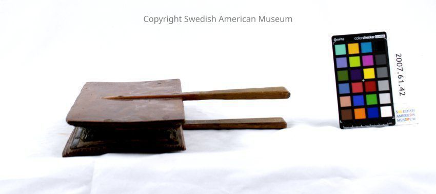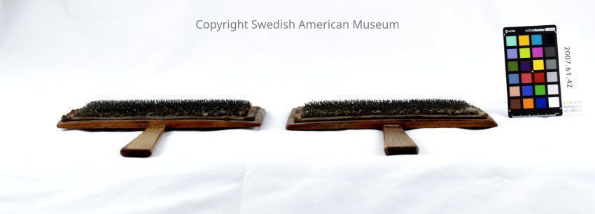Pair of brown wooden carding paddles. On the back of each wooden plane is a set of thorny black synthetic, needle-shaped, tooth-like structures that are used for the carding, which means combing wool, flax, etc. with a toothed comb.Acquisition