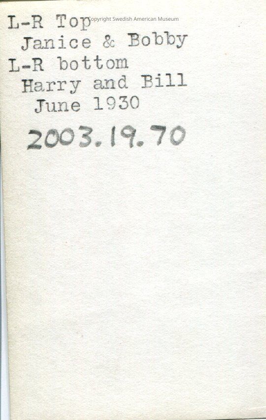 L-R Top / Janice & Bobby / L-R bottom / Harry and Bill / June 1930Language