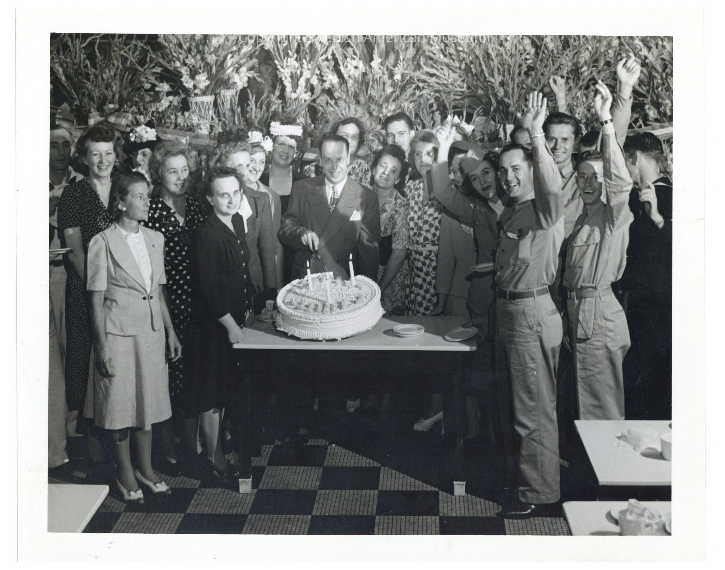 Black-and-white photograph of about twenty-five people at a party, circa 1965. The people are standing in front of a cake on a table.