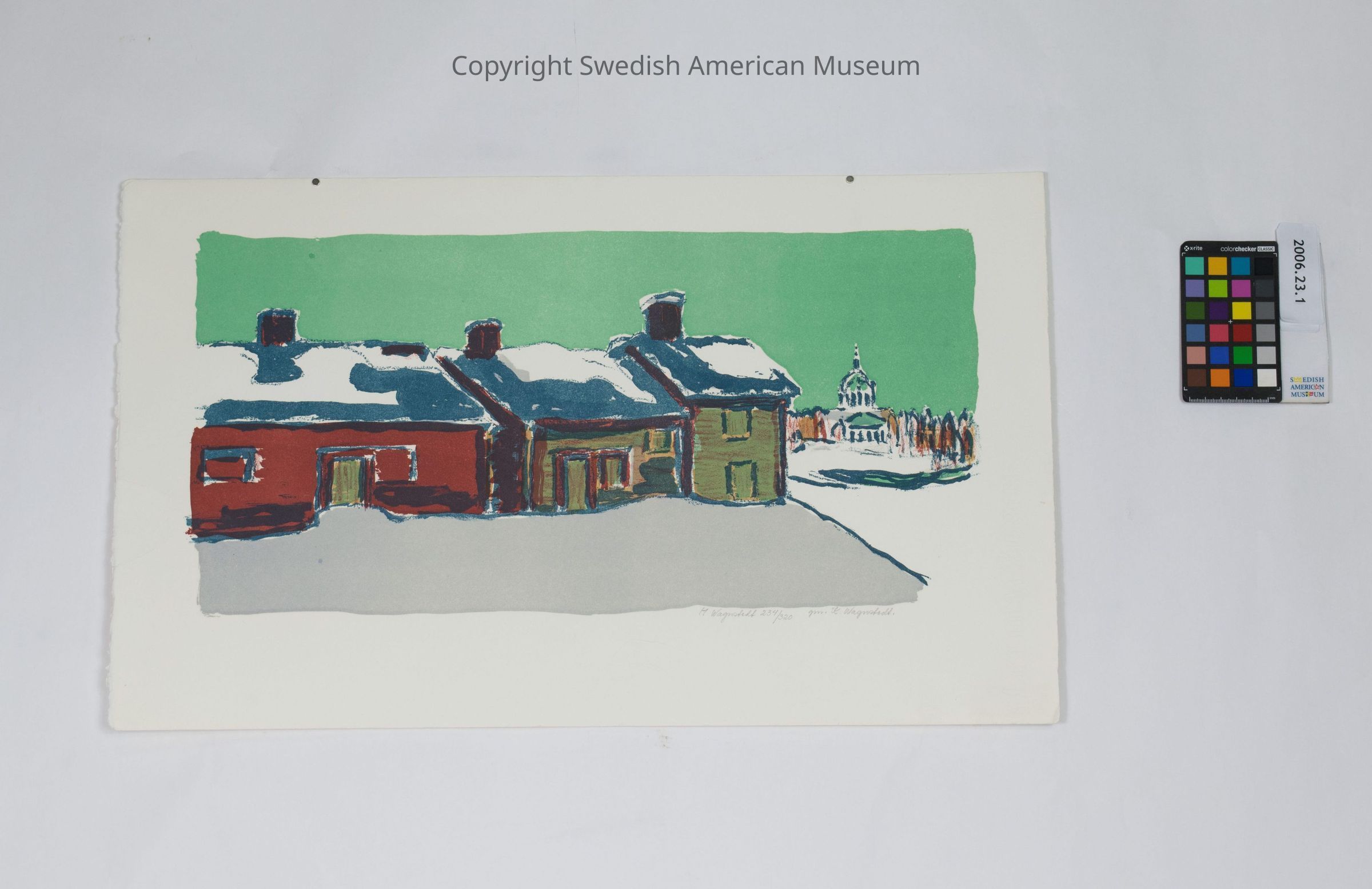 Lithograph by artist Hannes Wagnstedt. Depicts two heavily green houses and a heavily red house in the foreground with chimneys and slanted roofs. A white building with and a cylinder-shaped tower right above it is seen in a city-like setting in the distance. Snow covers the ground. The sky in the distance is spring green.Type of Print