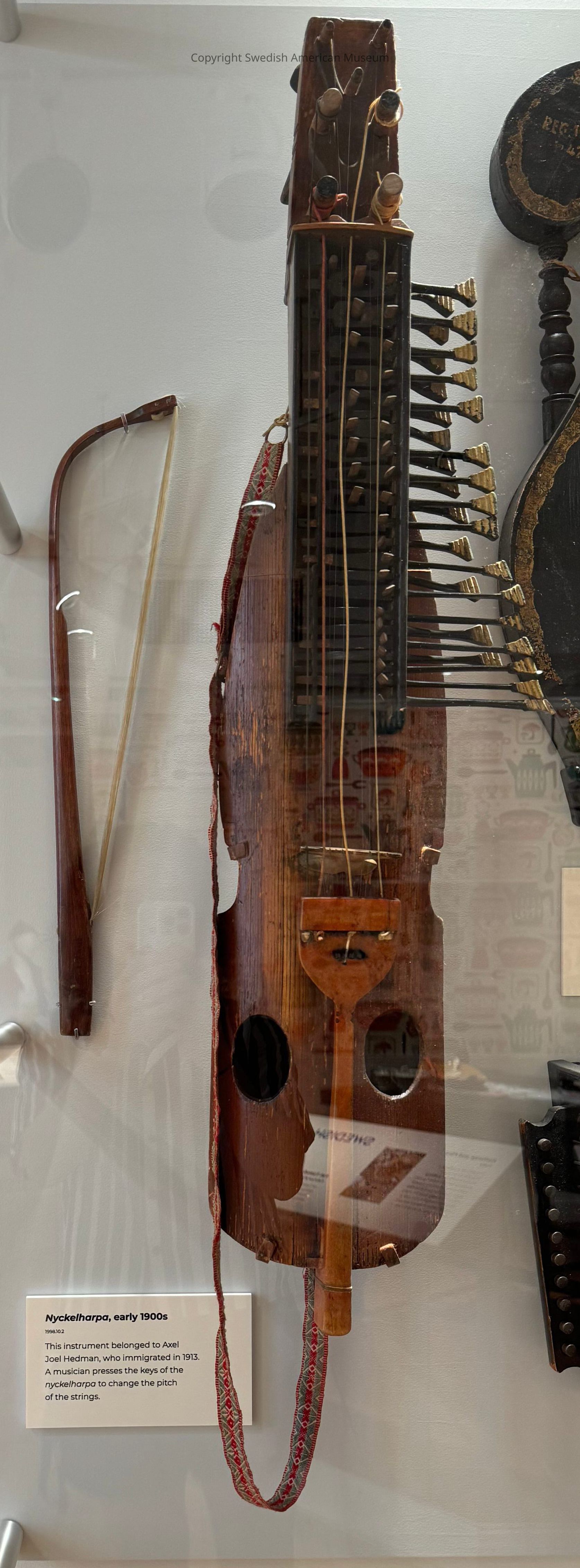 Axel Joel Hedman (1885 - 1971 moved to the United States in 1913 and worked as a cabinet and furniture maker and as a carpenter. The nyckelharpa was popular in the 19th and early 20th centuries and was a focal sound in Swedish folk music. By the mid-20th century, the instrument had decreased in popularity and use. However, by the 1960s and 1970s the nyckelharpa had a resurgence and began being used in contemporary music.Acquisition