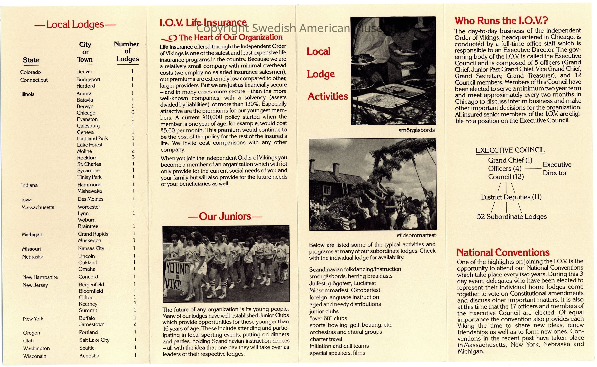 Tan Independent Order of Vikings pamphlet. Topics covered are "I.O.V. Life Insurance - The Heart of Our Organization," "Our Juniors," "Local Lodge Activities," "Who Runs the I.O.V.," "National Conventions," "What We Offer," and "Local Lodges."Context