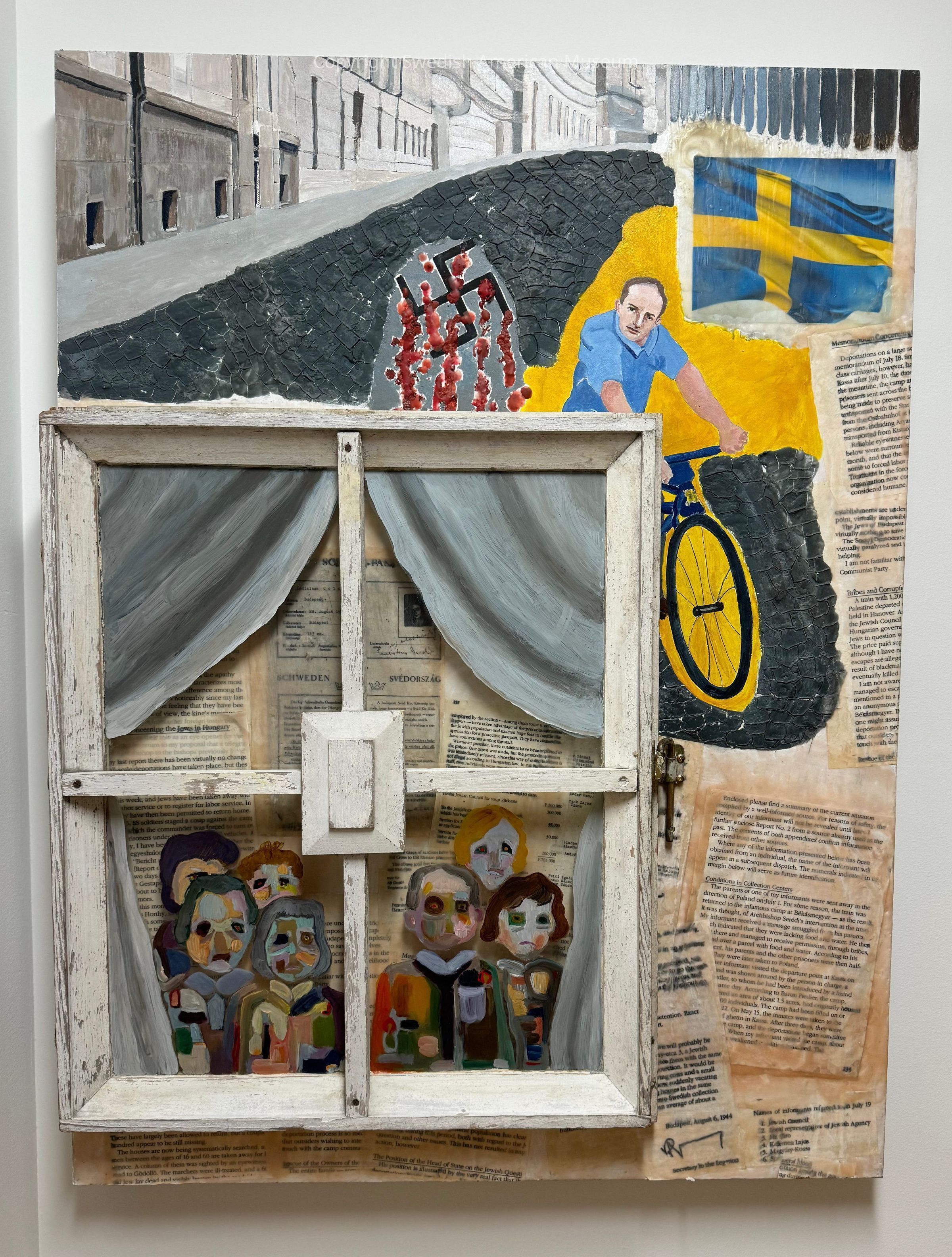 Encaustic, interactive multi-media collage entitled "Jewish Budapest 1944" by Jessica Fine. The collage shows a city-setting with Raoul Wallenberg wearing a blue shirt and black pants on a blue and black bicycle. He is traveling on a sloping yellow and black road. A gray and tan building is nearby, adjacent to a sloping gray road and a Swedish flag. To his left is a swastika dripping with blood. The background is largely covered with documents from World War II. A window with several people can be opened up at the bottom of the artwork.Artwork Details