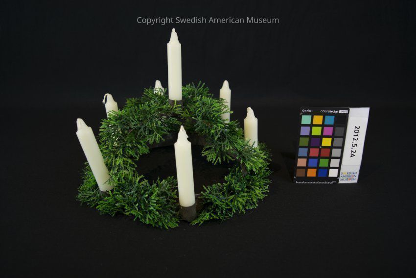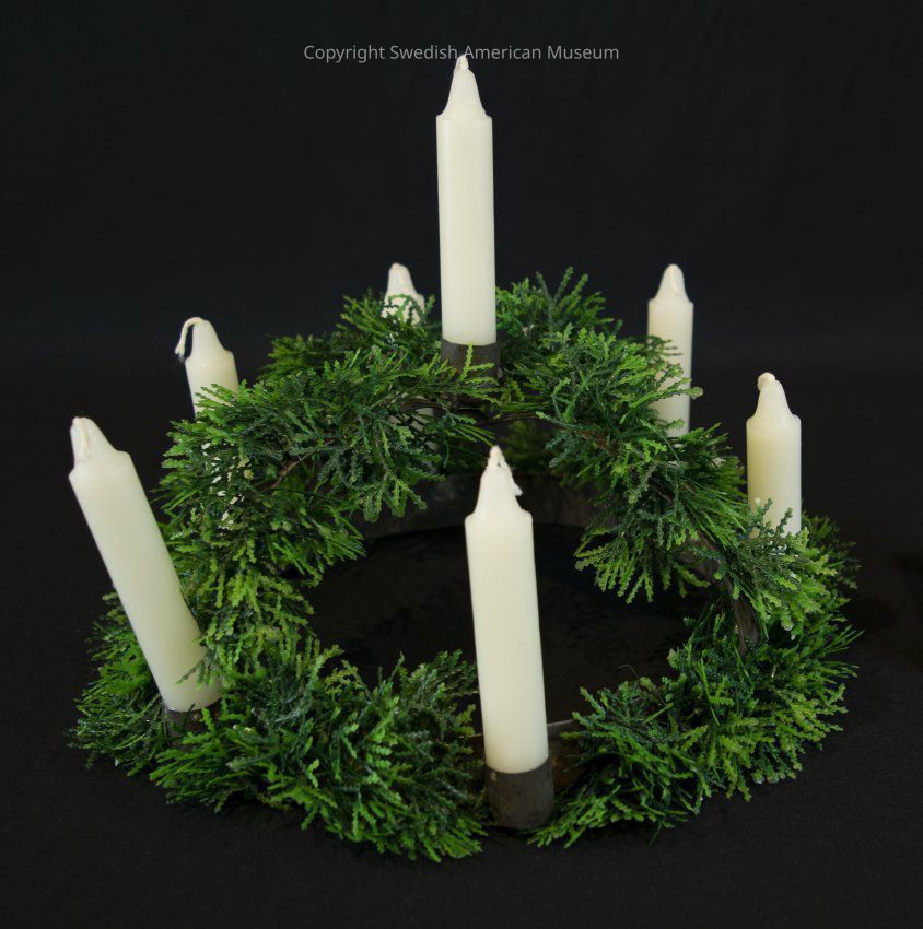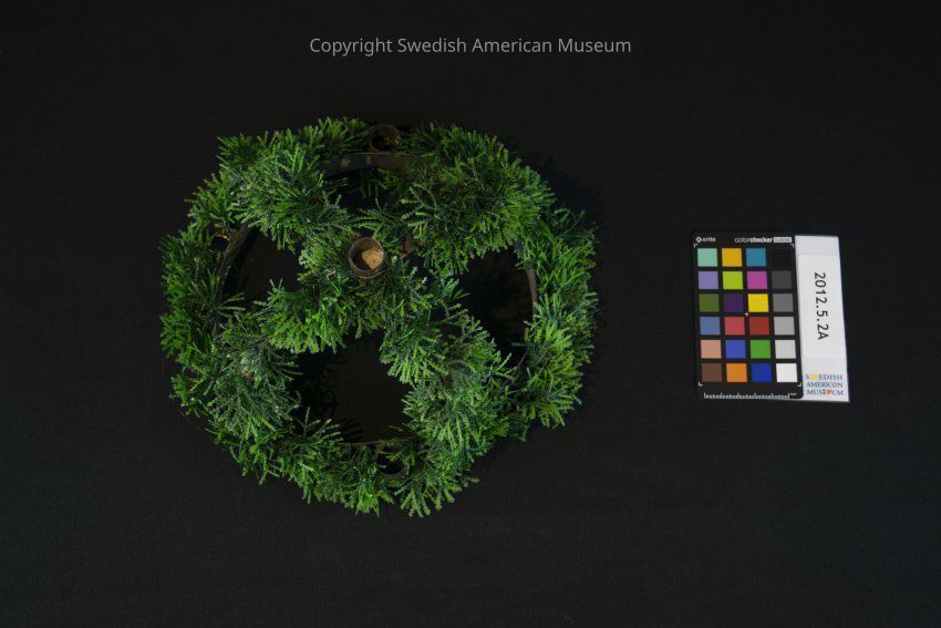 Lucia crown made of bronze-colored metal. Decorations of bright green and pine green evergreen leaves are wrapped around the crown. Seven bronze-colored round metallic inserts for candles, one of which has a bronze-colored metallic base.Context
