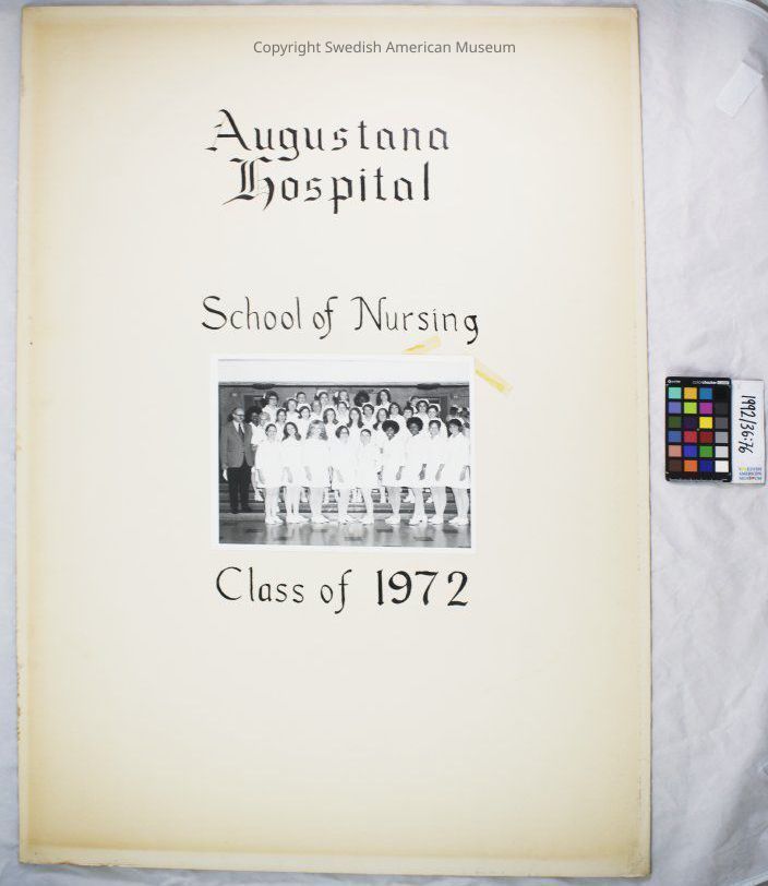 Large cream colored posterboard "Class of 1972" from the Augustana Hospital School of Nursing with a group photograph of graduating students.Context
