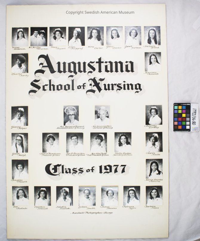 Large, cream colored posterboard "Class of 1977" from the Augustana Hospital School of Nursing with black-and-white photographs and names of twenty-nine graduating students.Context