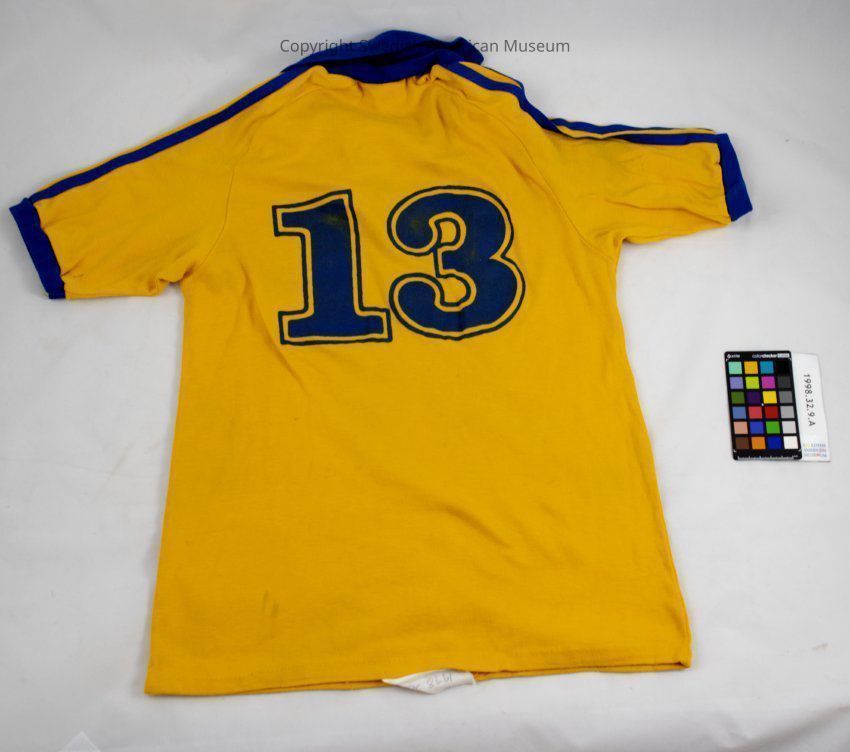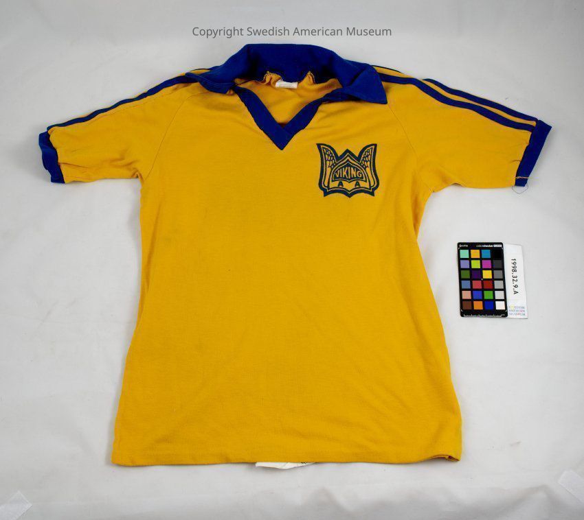 Blue and yellow cotton soccer jersey, number 13, from the Viking Athletic Association.Context