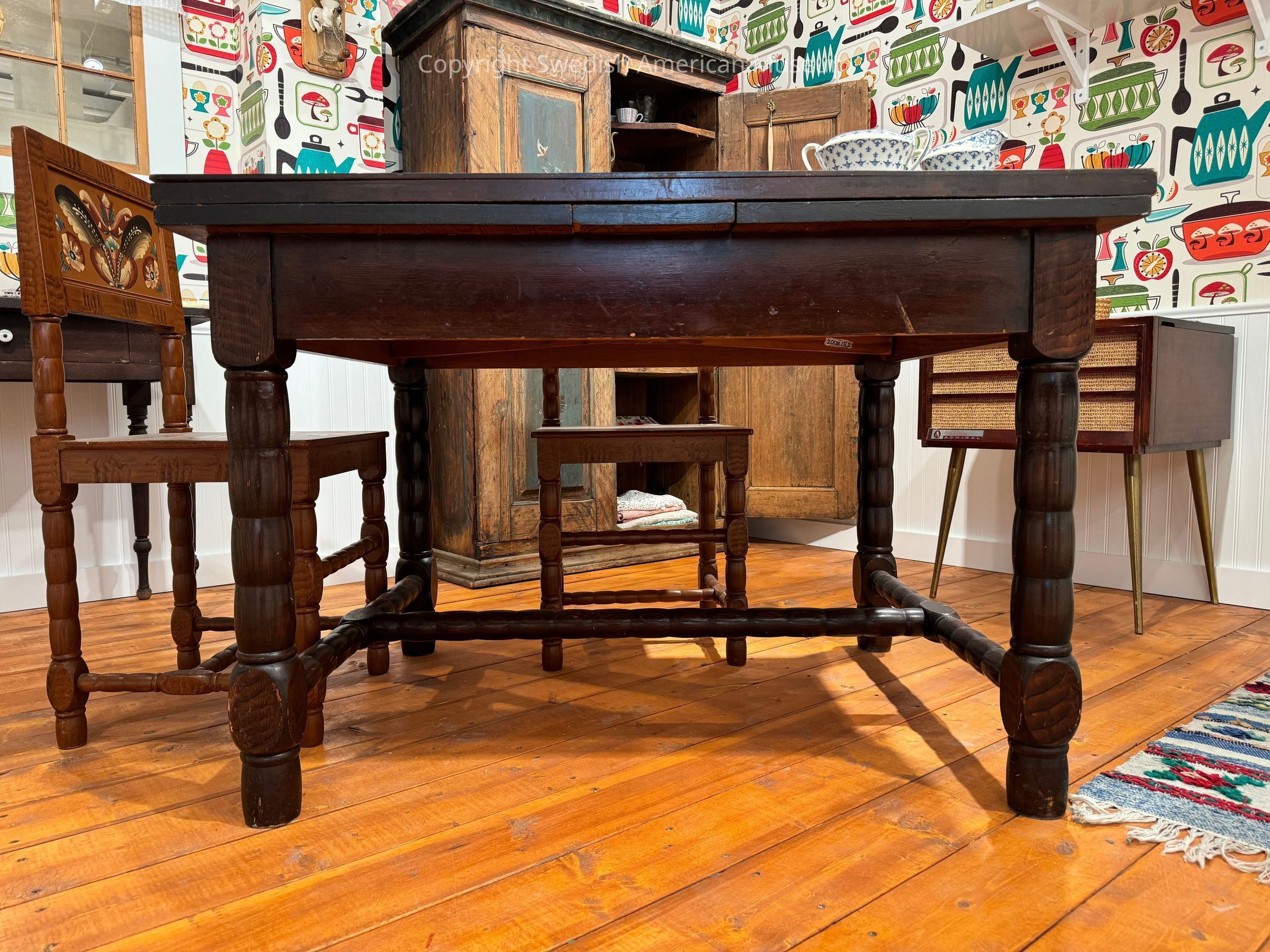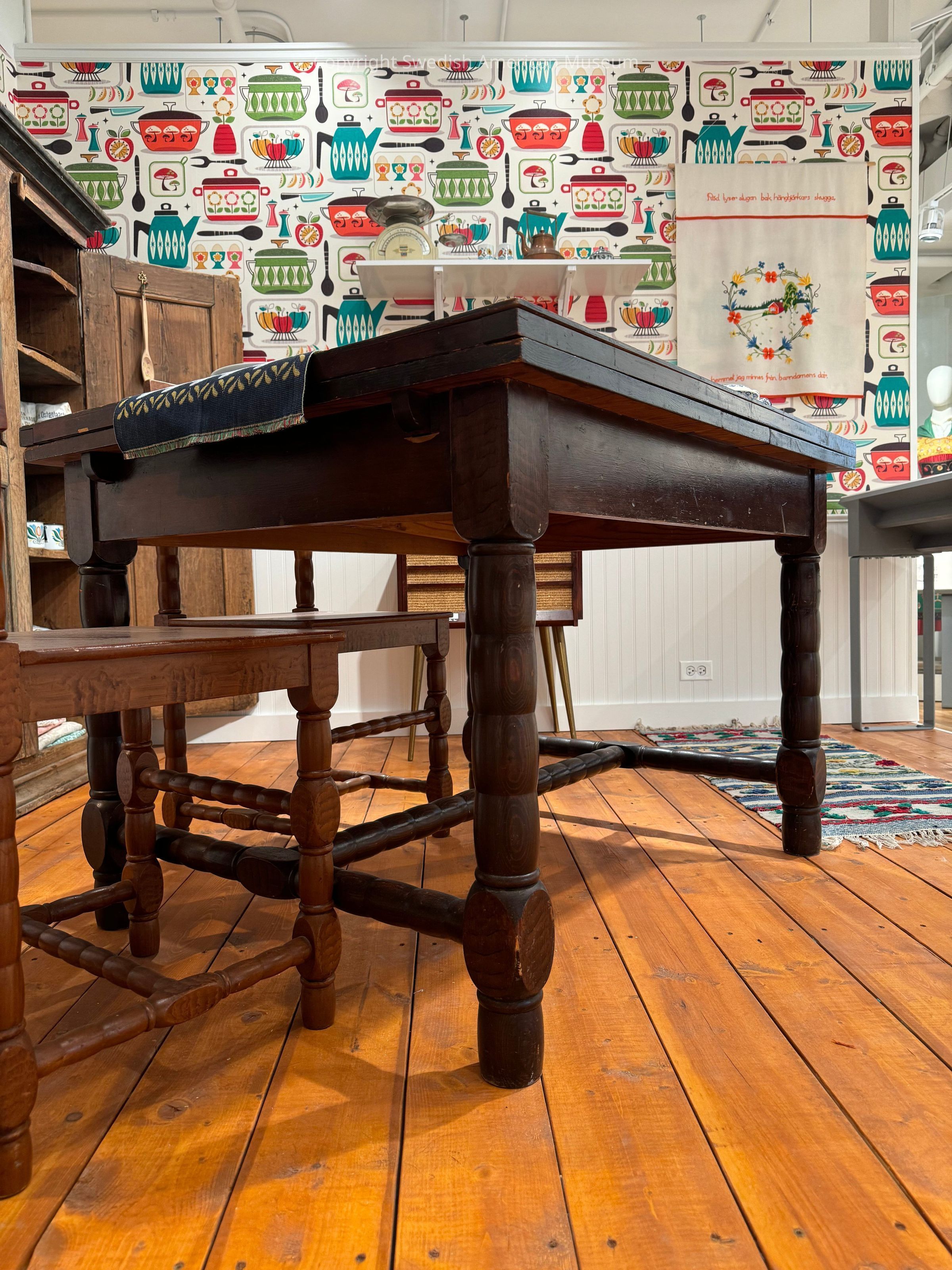 Brown wooden table that can open to make it larger and close to make it smaller. The table has rounded legs which have parts that extend outward more than others at regular intervals.