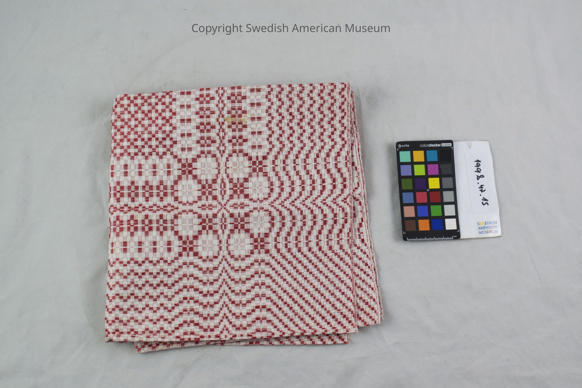 Square, red and white woven Swedish table linen. Monk's simple weave.