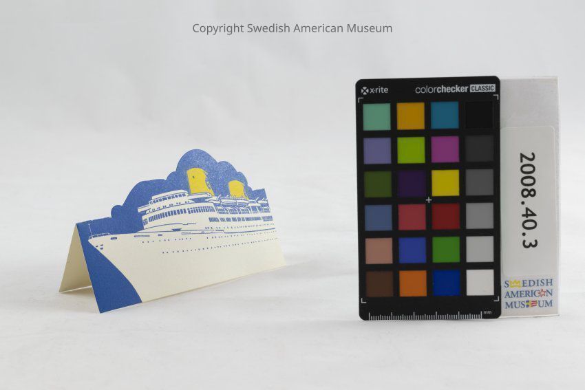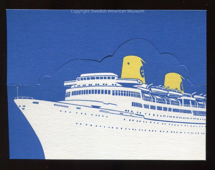 Paper cut-out of a Swedish American Line white ship on a blue background topped with two tall, rounded yellow structures, each of which is decorated with a blue circle with the three yellow crowns emblem.Context