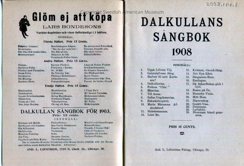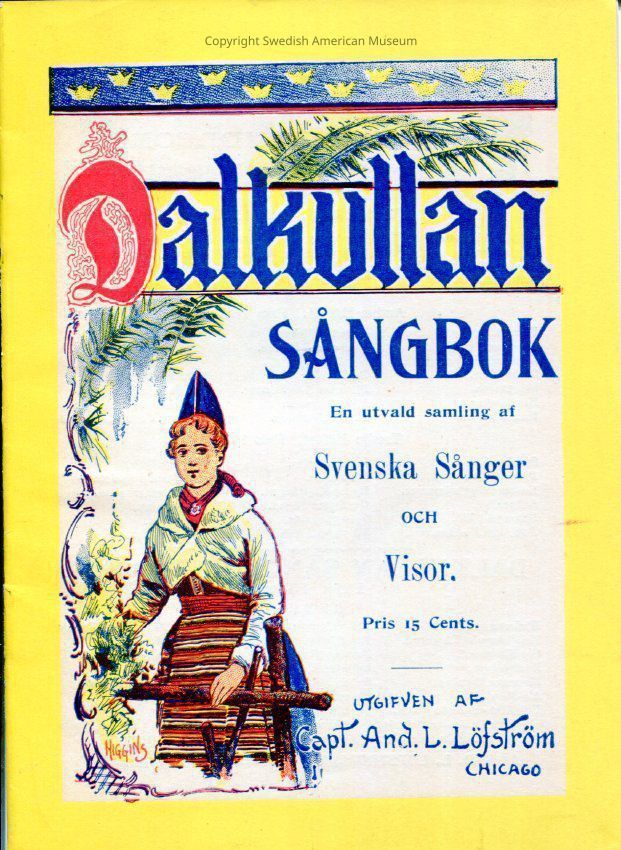 1908 "Dalkullan Sångbok." The front depicts a woman in a provincial costume carrying a wooden cane. The front cover has the inscriptions, "Dalkullan Sångbok," "En Utvald Samling Af Svenska Sånger och Visor.," "Pris 15 Cents," and "Utgifven Af Capt. And. L. Löfström Chicago."Acquisition