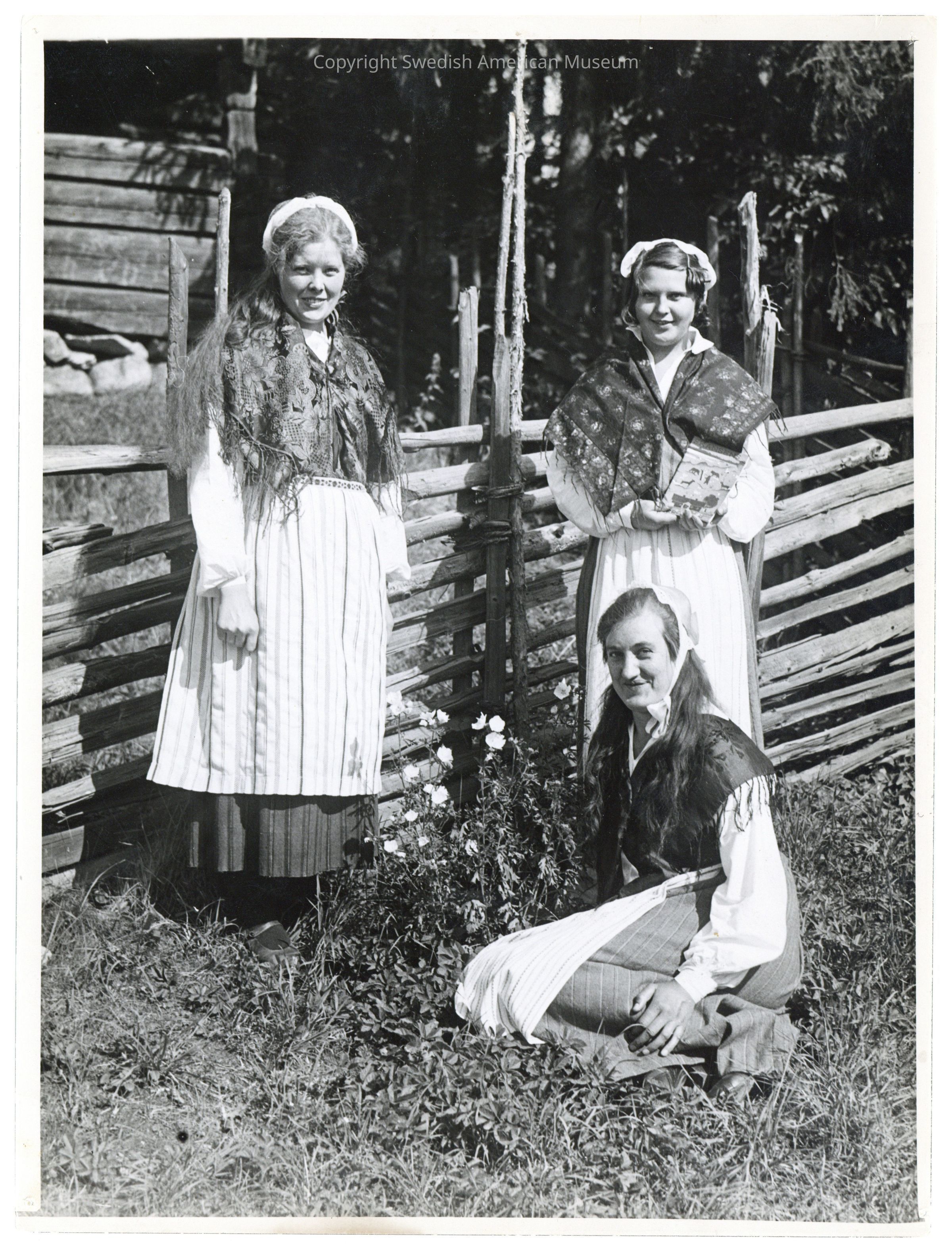 Photograph of three women at Skansen museum in Stockholm, Sweden wearing folk costumes, two of whom are standing, one of whom is sitting. The back of the photograph reads, "Skansen 1933," "John G. Palmer 5814 N. Washtenaw Ave. Chicago 45, Illinois."Title