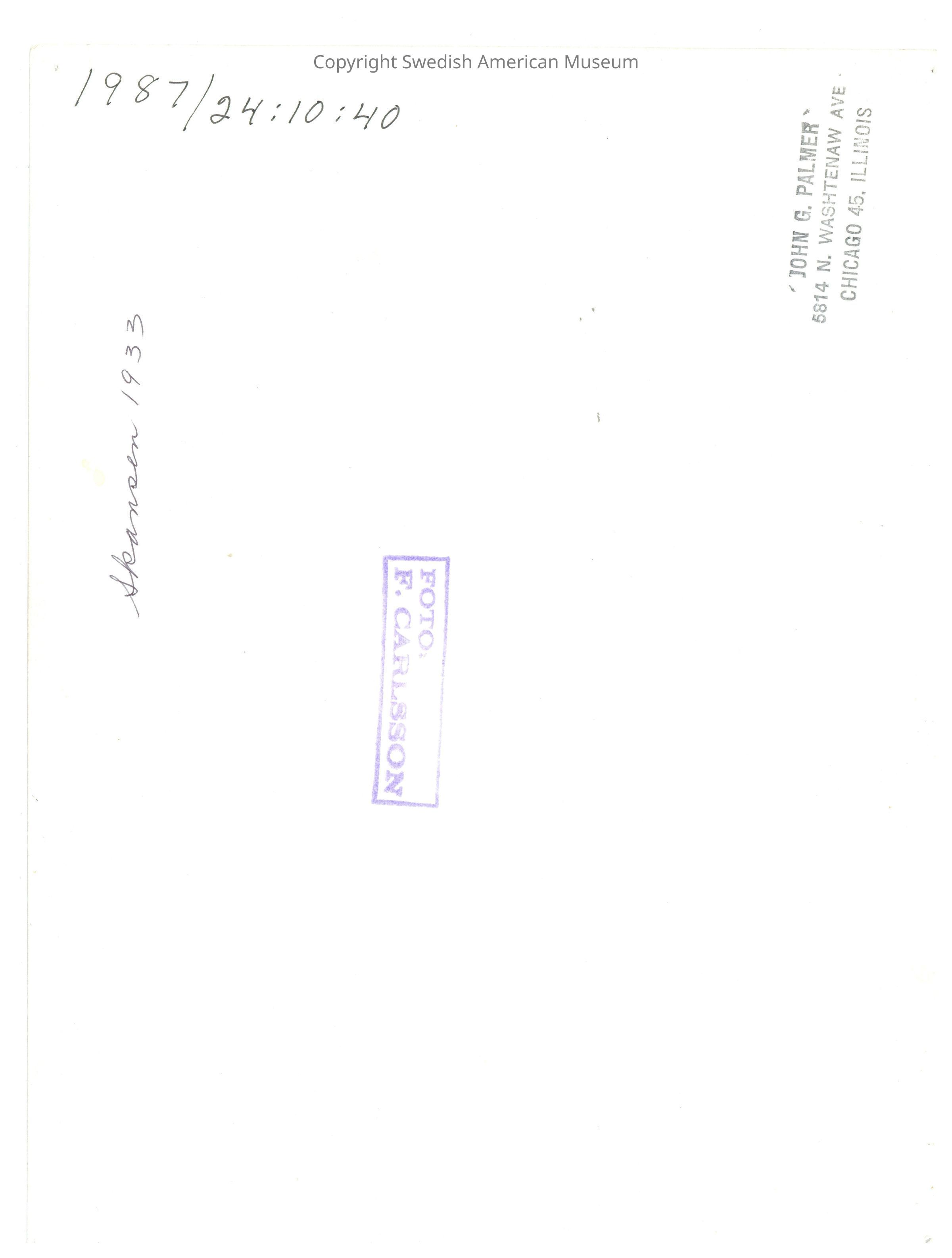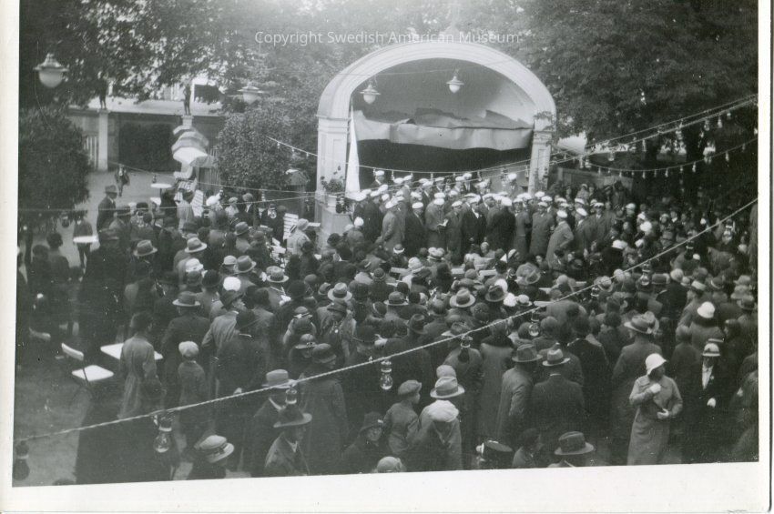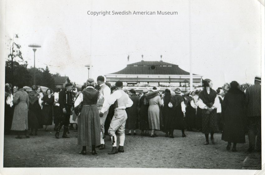 Photograph of people gathered in a park setting at Skansen museum, Stockholm, Sweden. Many of them are wearing folk costumes. The back of the photo reads, "Skansen 1933" and "John G. Palmer 5814 N. Washtenaw Ave. Chicago 45, Illinois."Title