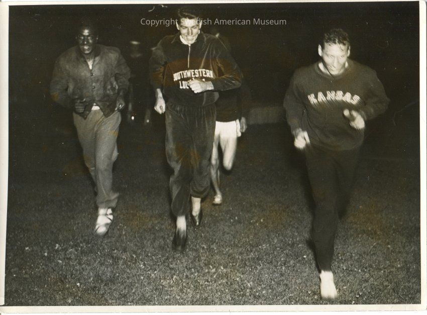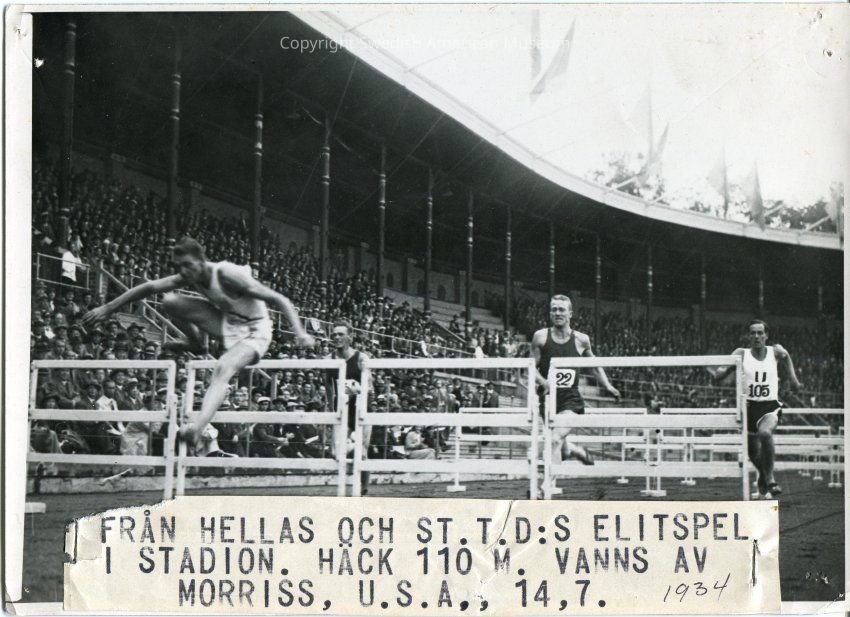 Photograph of three American athletes training by running in 1934. Likely preparing for "Elitspelen", at Stockholm Stadium, 1934.Date(s) of Creation