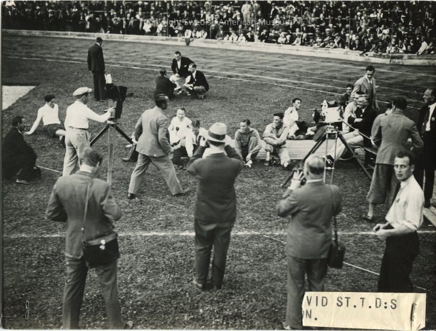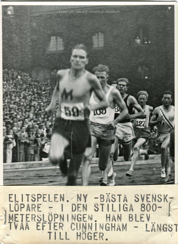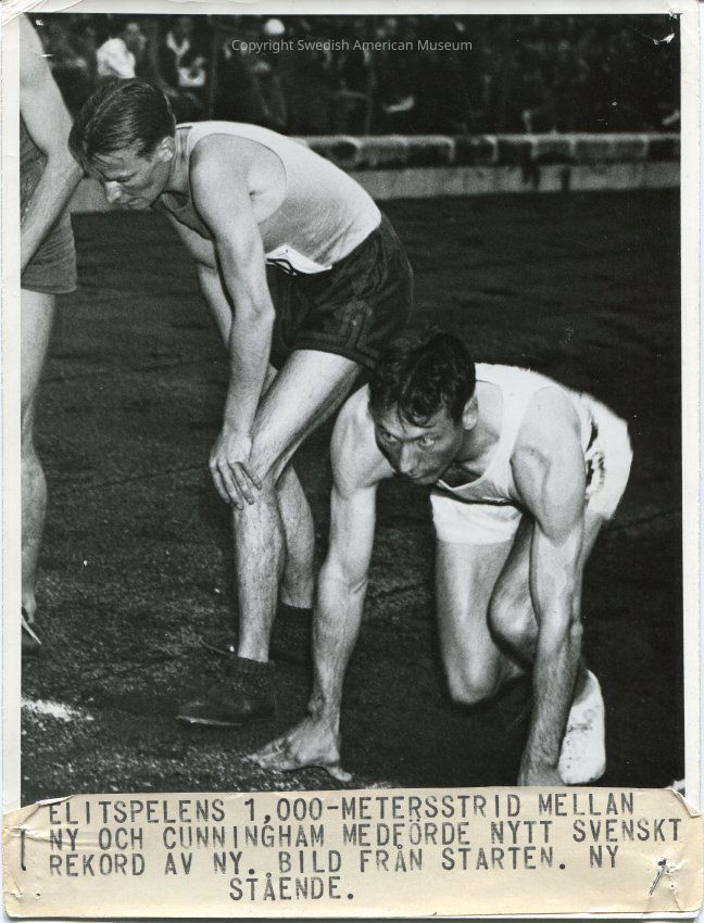 Photograph of two men, the Swedish athlete Ny and the American athlete Cunningham during a 1000 meter run. Attached label reads, "Elitspelens 1,000-Metersstrid Mellan Ny Och Cunningham Medförde Nytt Svenskt Rekord Av Ny. Bild Från Starten. Ny Stående." Ny, standing to the left, broke a new record. "Elitspelen", at Stockholm Stadium, 1933.Date(s) of Creation