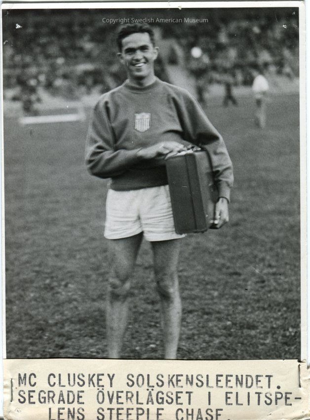 Photograph of a man wearing a dark-colored shirt. Attached label reads: "Mc Cluskey Solskensleendet. Segrade Överlagset i Elitspelens Steeple Chase." Taken during "Elitspelen", at Stockholm Stadium, 1933.Date(s) of Creation