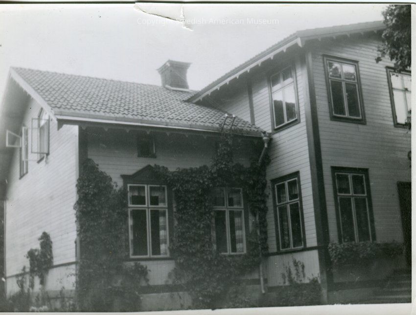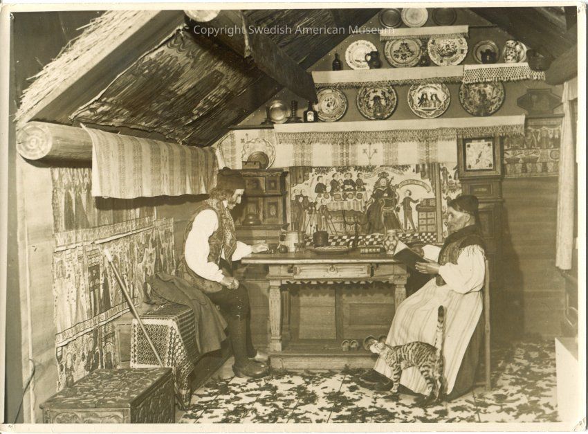 Photograph of a scene from a stuga at the Nordic Museum in Stockholm. The back of the photograph reads, "Nordiska Museet N Stockholm" and "John G. Palmer 5814 N. Washtenaw Ave. Chicago 45, Illinois."Title