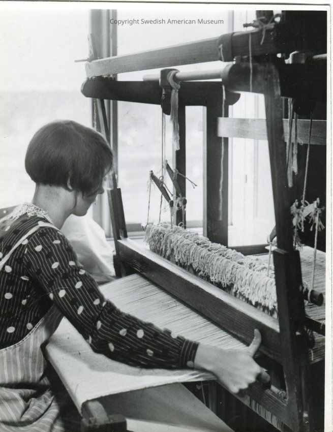 Photograph of a woman wearing a predominantly dark-colored blouse decorated with light-colored polka-dots and thin, light-colored lines. The woman is using a loom.Subjects