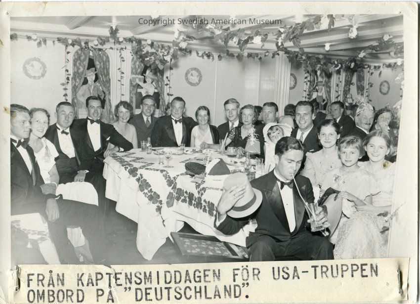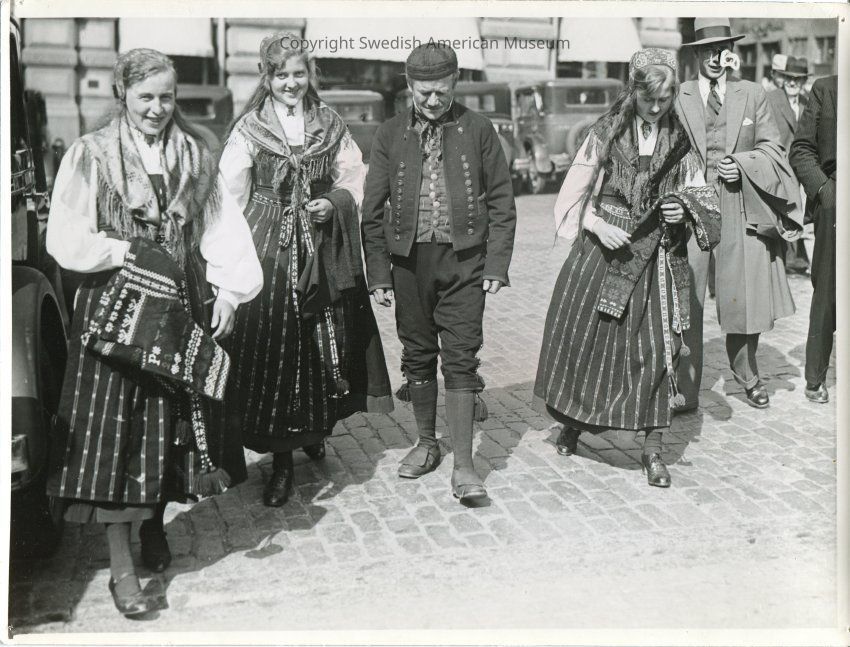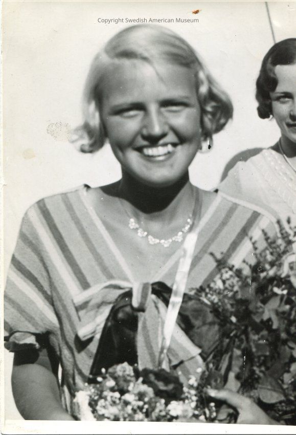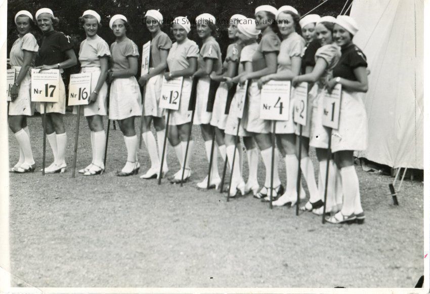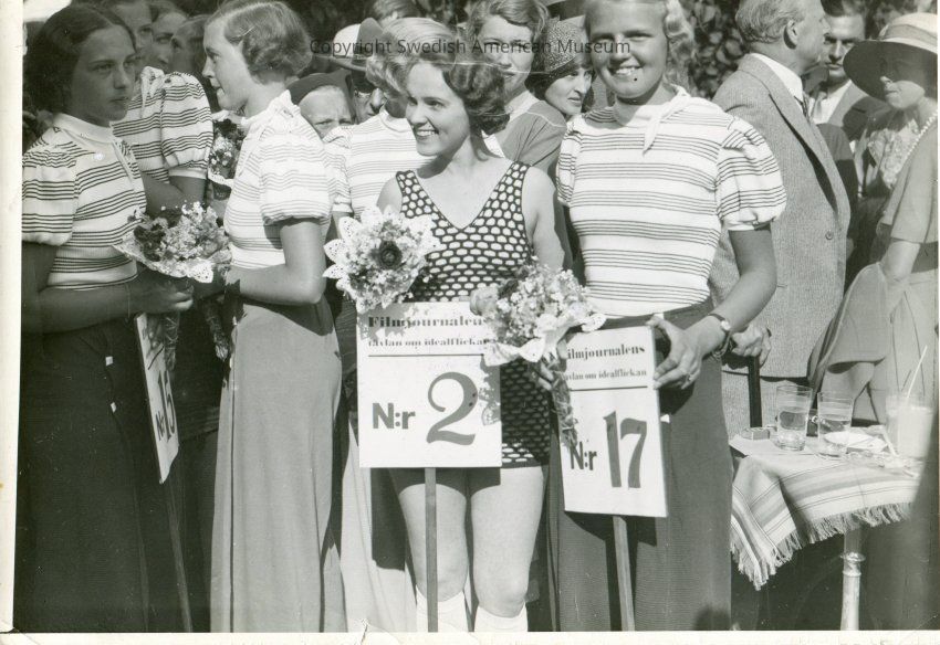 Photograph of a large group of people with four young women in the forefront, the first of whom is wearing a light-colored blouse with dark-colored stripes and a dark-colored skirt and holding a bouquet of light, medium, and dark-colored flowers, the second of whom is wearing a light-colored blouse with medium-colored stripes. The back of the photo reads, "Miss Sweden 1934."Date(s) of Creation