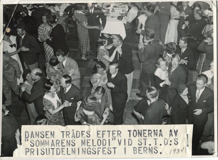 Photograph of people dancing at a special event in 1934. It has the attached inscription, "Dansen Trades Efter Tonerna Av "Sommarens Melodi" Vid S.T.T.D:S Prisutdelningsfest I Berns".Date(s) of Creation