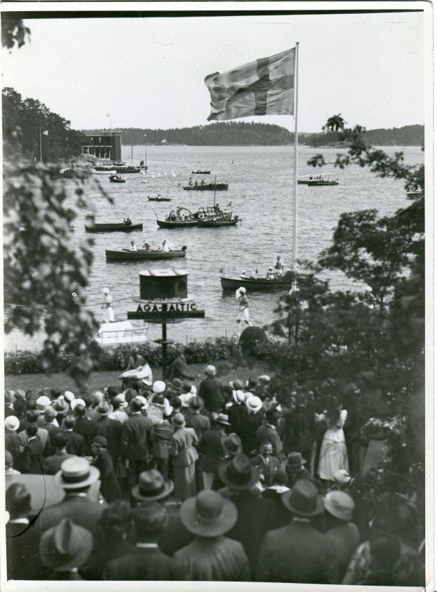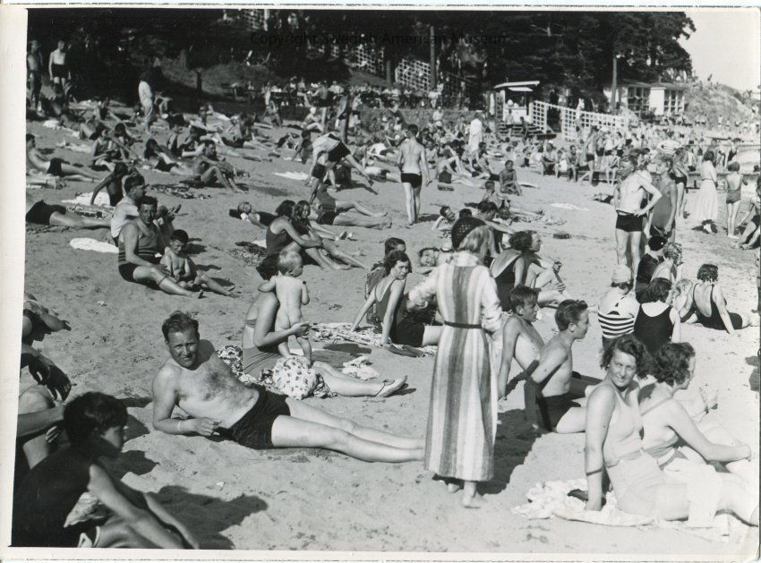 Photograph of people at a large beach near a lake. It has the attached inscription, "Solviksbadet I Stockholm Är Verkligt Populärt." The photograph was taken in Stockholm on Jul. 10, 1933.Date(s) of Creation