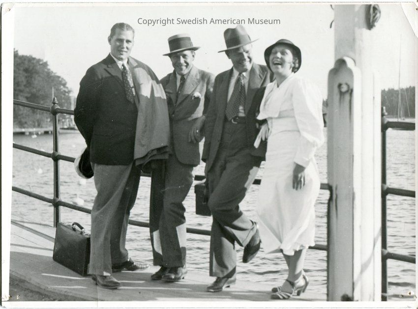 Photograph of Marie-Ann Henning with three newspaper men in Stockholm, Sweden.Title