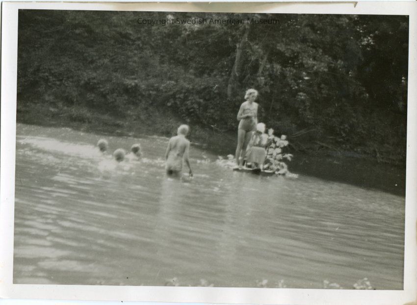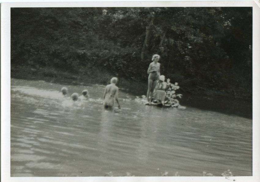 Photographs of four women and two men in a lake with two of the women sitting and standing in a boat-like structure.Title