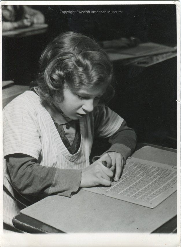 Photograph of a girl sitting at a desk, reading material which appears to be written in braille.Title