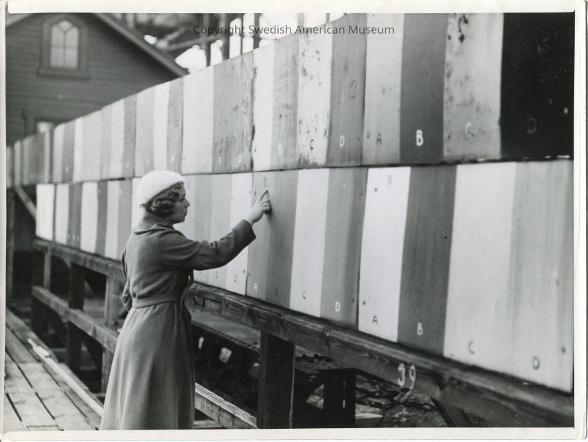 Photograph of Marie-Ann Henning at a paint-testing place in Stockholm, Sweden. The back of the photograph reads, "Foto F. Carlsson," "28 Aug.," and "28 Aug. 1933" written in purple letters.Date(s) of Creation