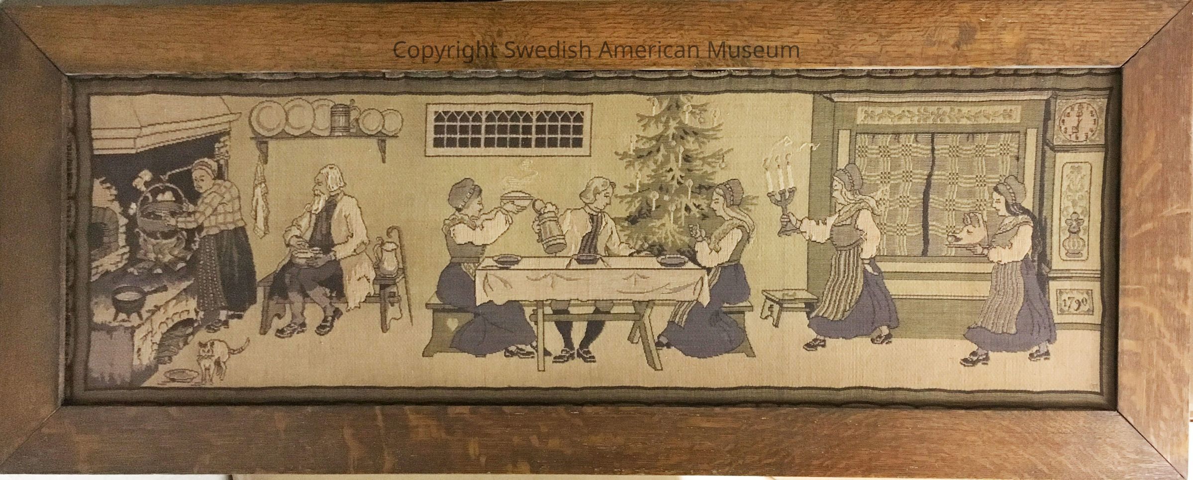 Christmas scene (juletid) linen tapestry in a wooden frame. Depicts a room in a home with eight people in various stages of cooking, eating, drinking, and decorating. A Christmas tree can be seen in the background. A hearth is to the left and a table is in the center. A clock in the right corner shows the date 1790. Made circa 1913.Context