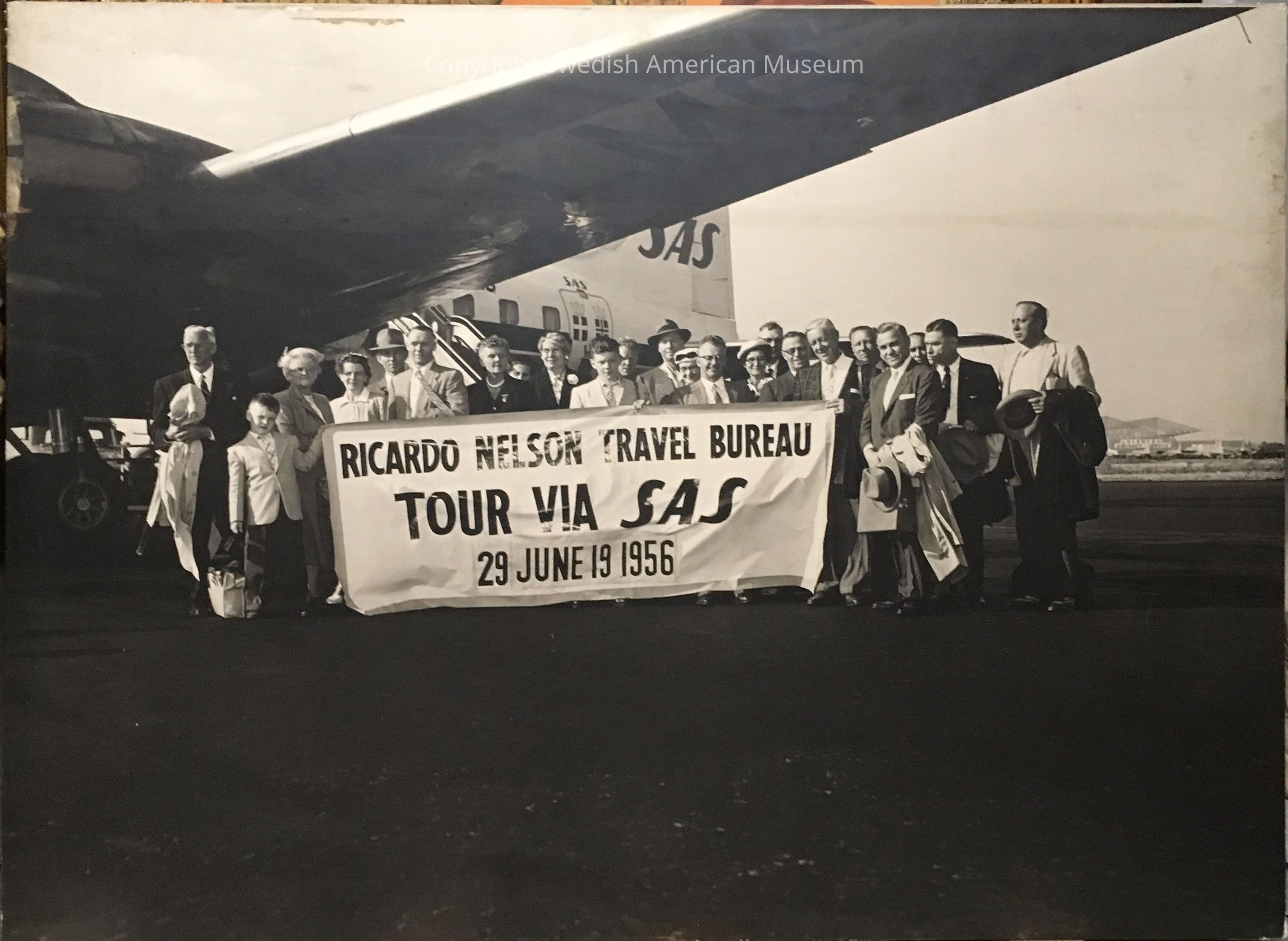 Ricardo Nelson Travel Bureau group photograph mounted as a poster. A group of people are standing in front of an airplane holding a sign with the words "Ricardo Nelson Travel Bureau Tour Via SAS 29 June 19 1956".
