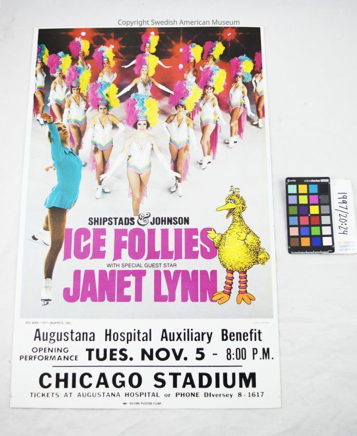 Poster advertisement for Shipstads & Johnson "Ice Follies" benefit event for the Augustana Hospital, 1974.