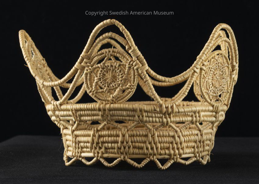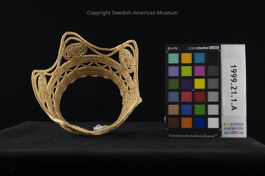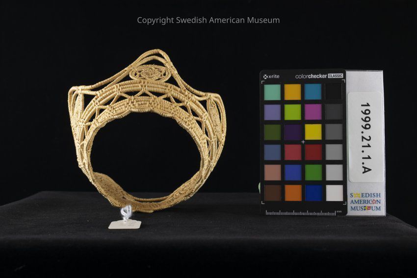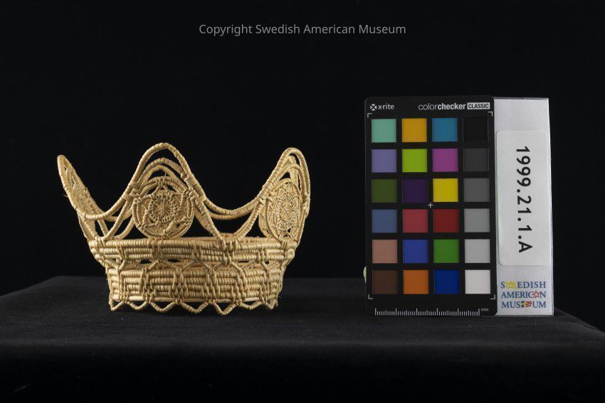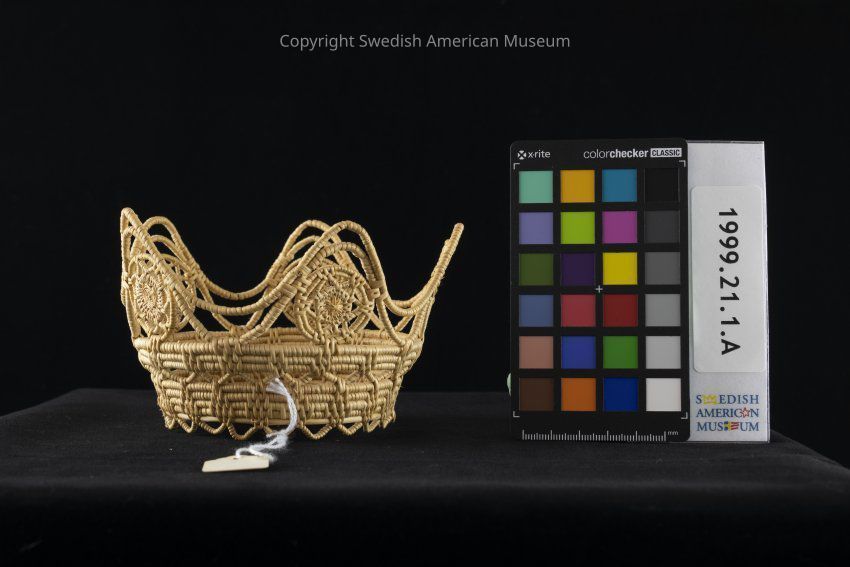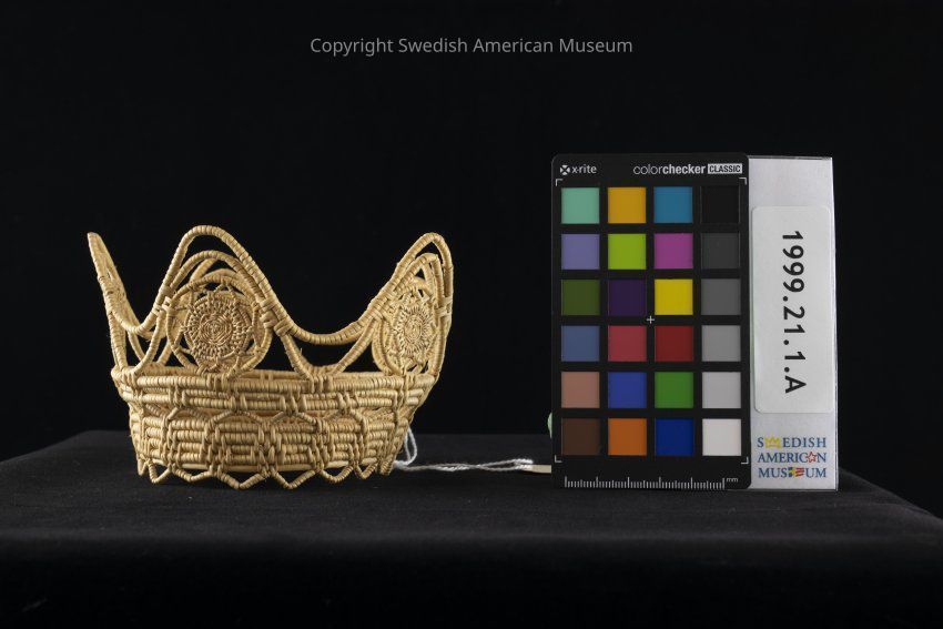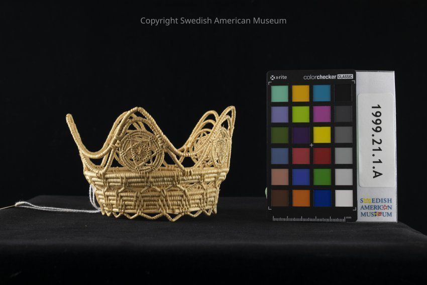 Small Swedish bridal crown made of straw. It is composed of woven designs in each of its five peaks. Undated.Context