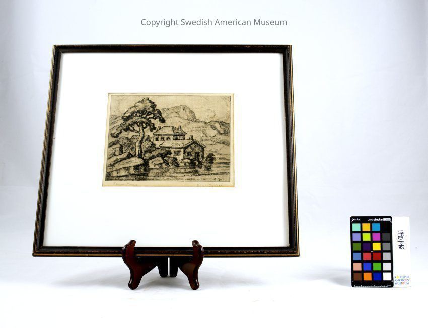 A small original drypoint etching print made by Birger Sandzén (1871-1954) in 1933 in Lindsborg, Kansas, entitled "Canyon Houses." The print is signed by Sandzén and is mated and framed. This print is one of 35 editions of the original etching.Type of Print