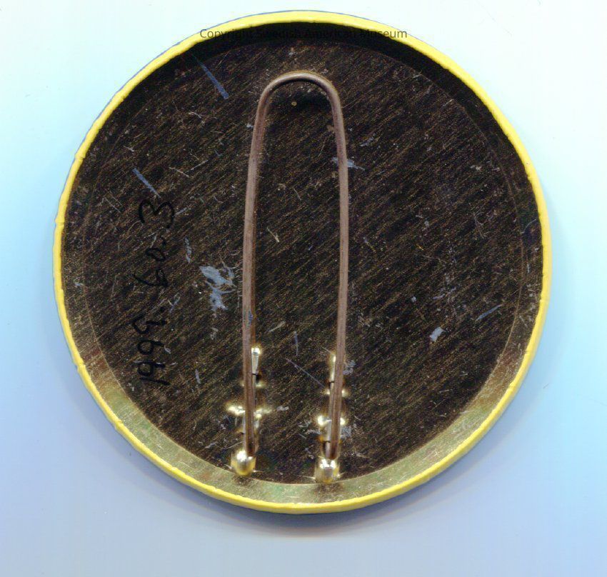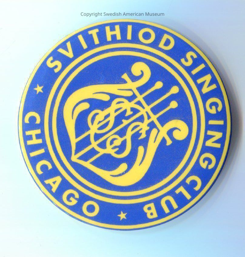 Svithiod Singing Club of Chicago pin. Blue background and yellow printing. The center shows the club's symbol, a harp with the letters SSC entwined. Around the edge are the words "Svithiod Singing Club Chicago." Dated circa 1940.Context