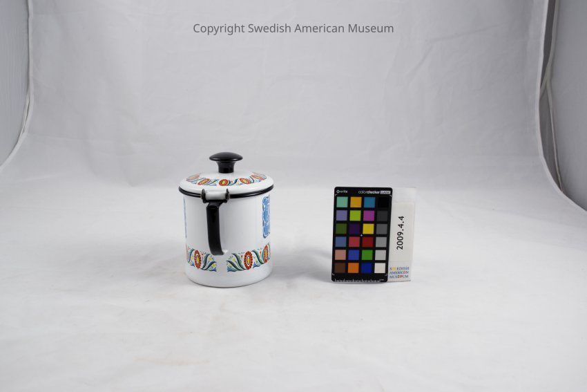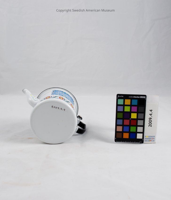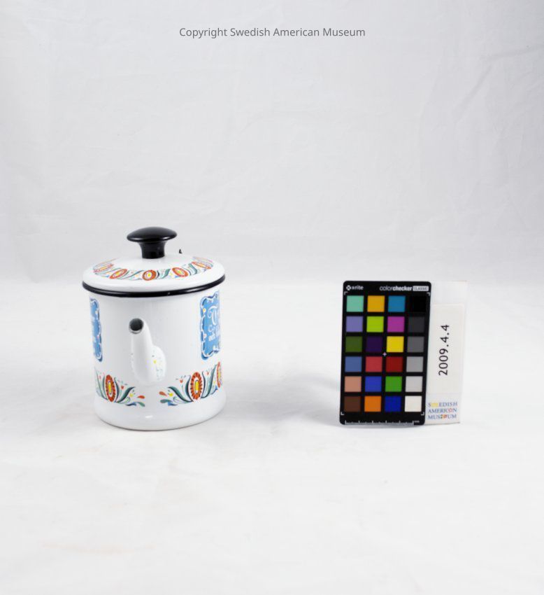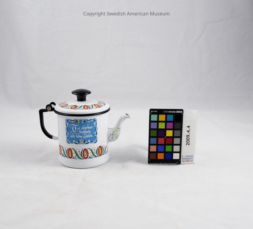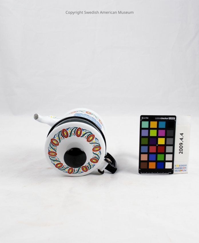 White tin tea pot with a black handle. The main part and the lid are decorated with a Swedish Dala painting motif of orange oval-shaped flowers with white, yellow, and black centers, blue tulip-like flowers with black stems, and yellow and orange tulip-like flowers with green stems and winding green leaves.Acquisition