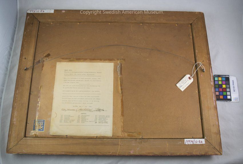 The painting has a typed sheet attached to the back indicating that the painting was given by the Hälsingland Good Templars District Lodge to Editor in Chief, E. Einar Andersson (of Chicago) in recognition of his work on behalf of the Good Templar organization in the United States in 1946.Acquisition