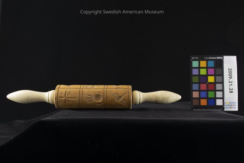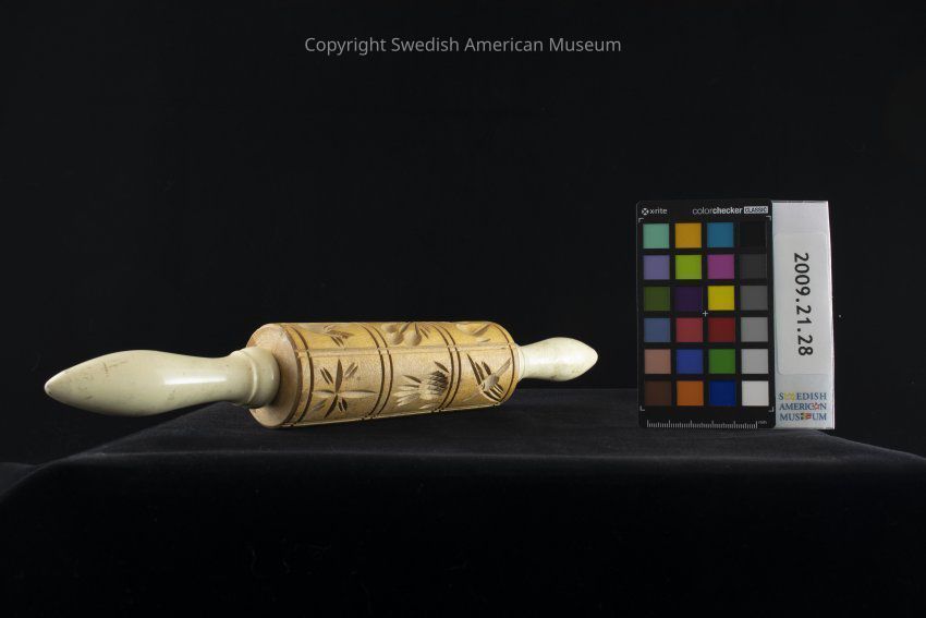 Tan rolling pin for baking with two white handles. The main part is round and decorated with carvings of birds, various four-legged animals, a flower with stems and leaves, a twig with leaves, a Christian cross, a lamp-like structure, and a berry-like fruit.Acquisition