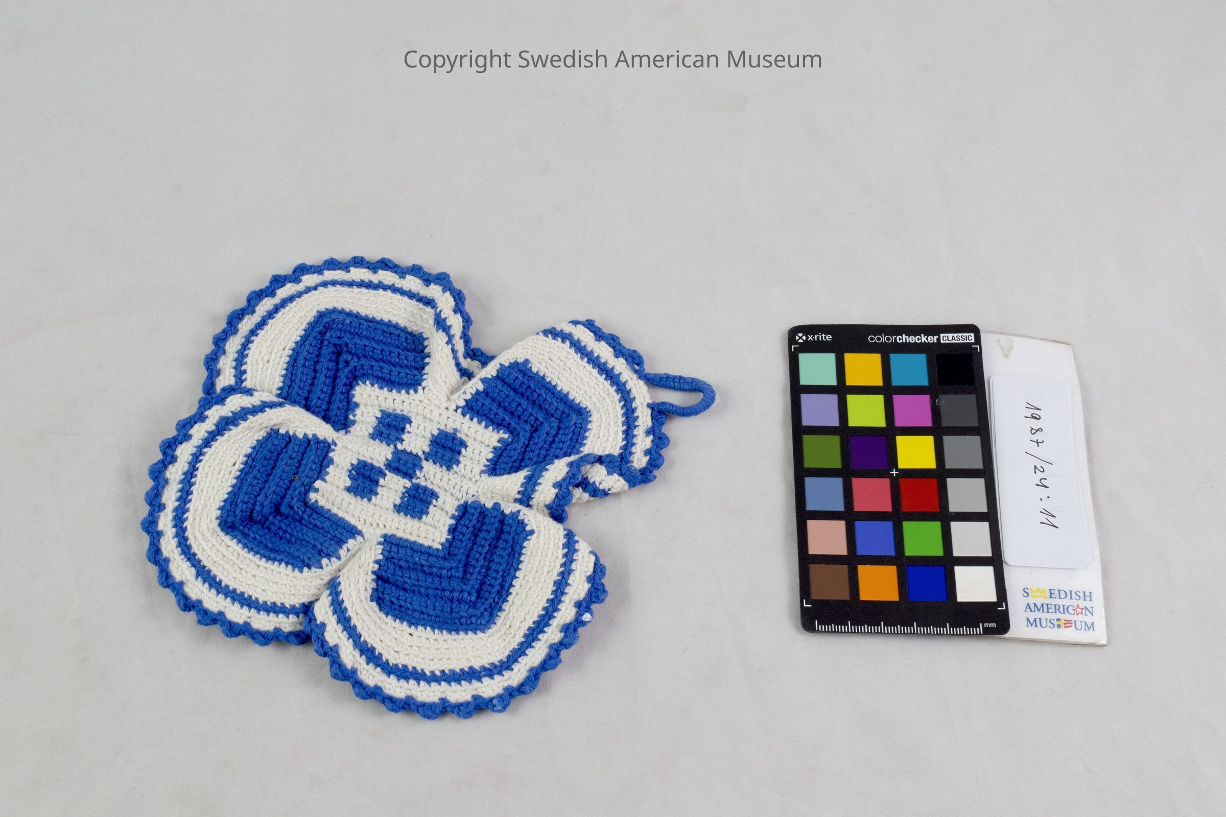 Hand-crocheted potholder in the shape of a blue and white four-leaf clover. The center has a small checkboard pattern.Acquisition
