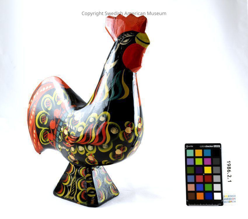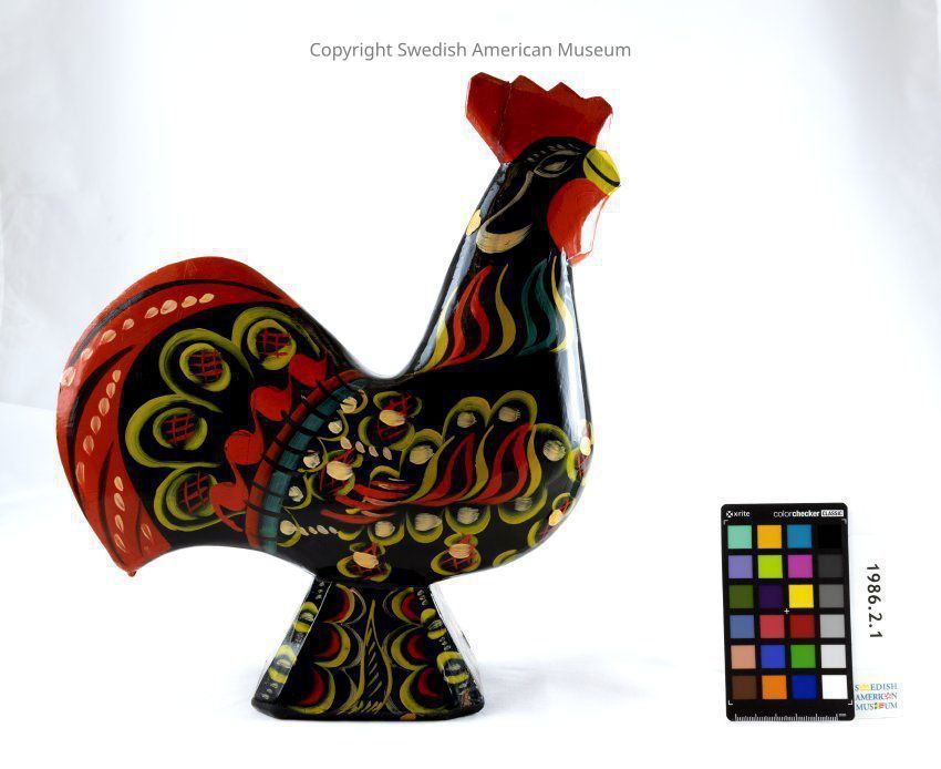 Hand-carved wooden "Dalatupp" or Dala Rooster. Black with areas of red, blue, green and white. This similar design continues along the length of the base. At the base, the rooster has a white label with the inscription, "ÄKTA DALAHEMSLÖJD, Tillv. Nils, Olsson, Nusnäs, Mora, Sweden." (Akta Dalahemslojd tillv. Nils Olsson. Nusnas, Mora Sweden)Acquisition