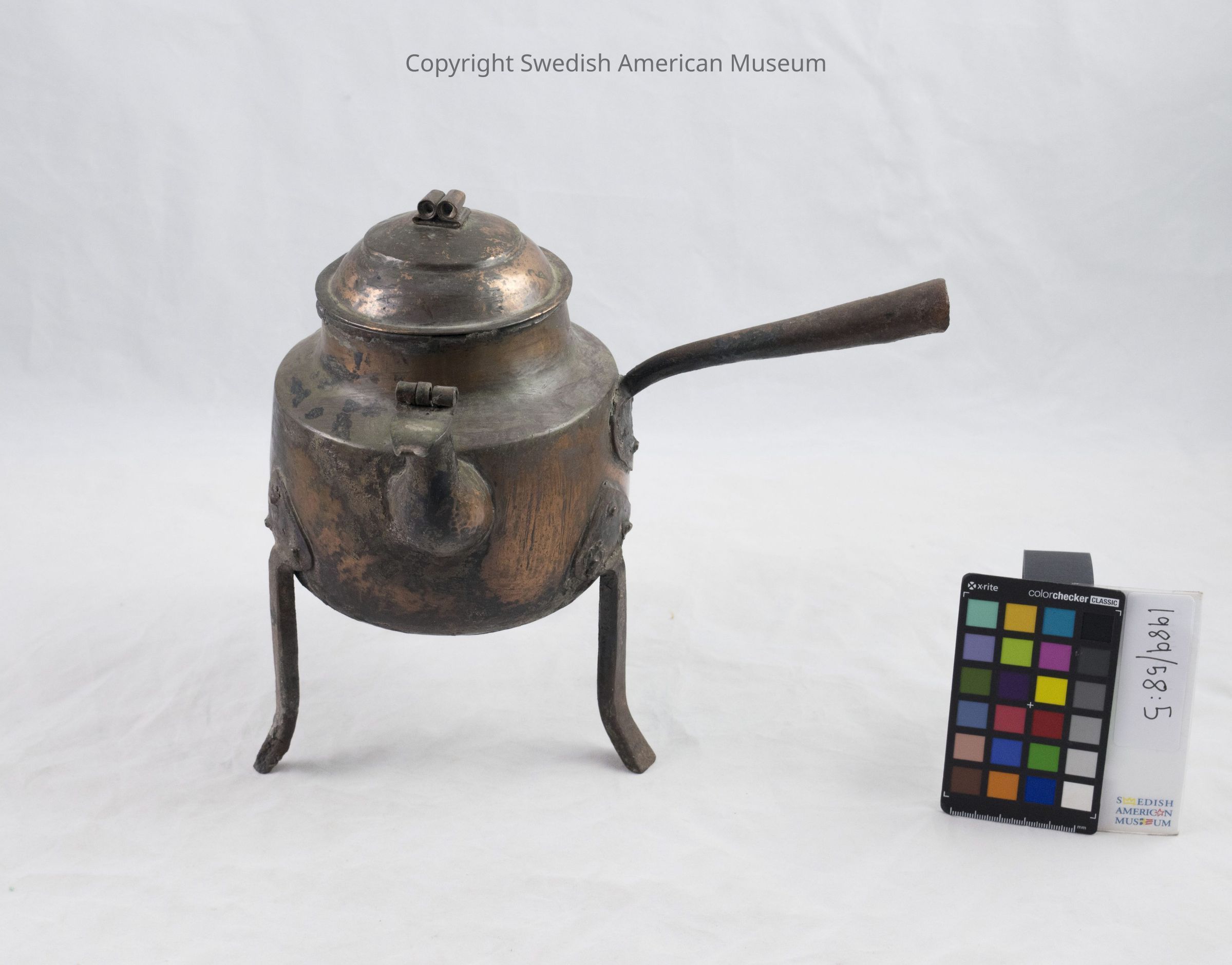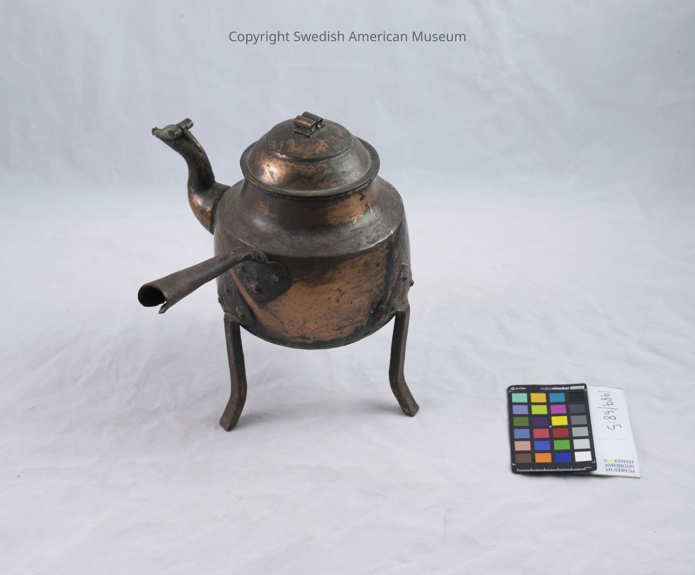 Three-legged copper coffee pot with a handle made of metal. The coffee pot was likely made during the nineteenth century.