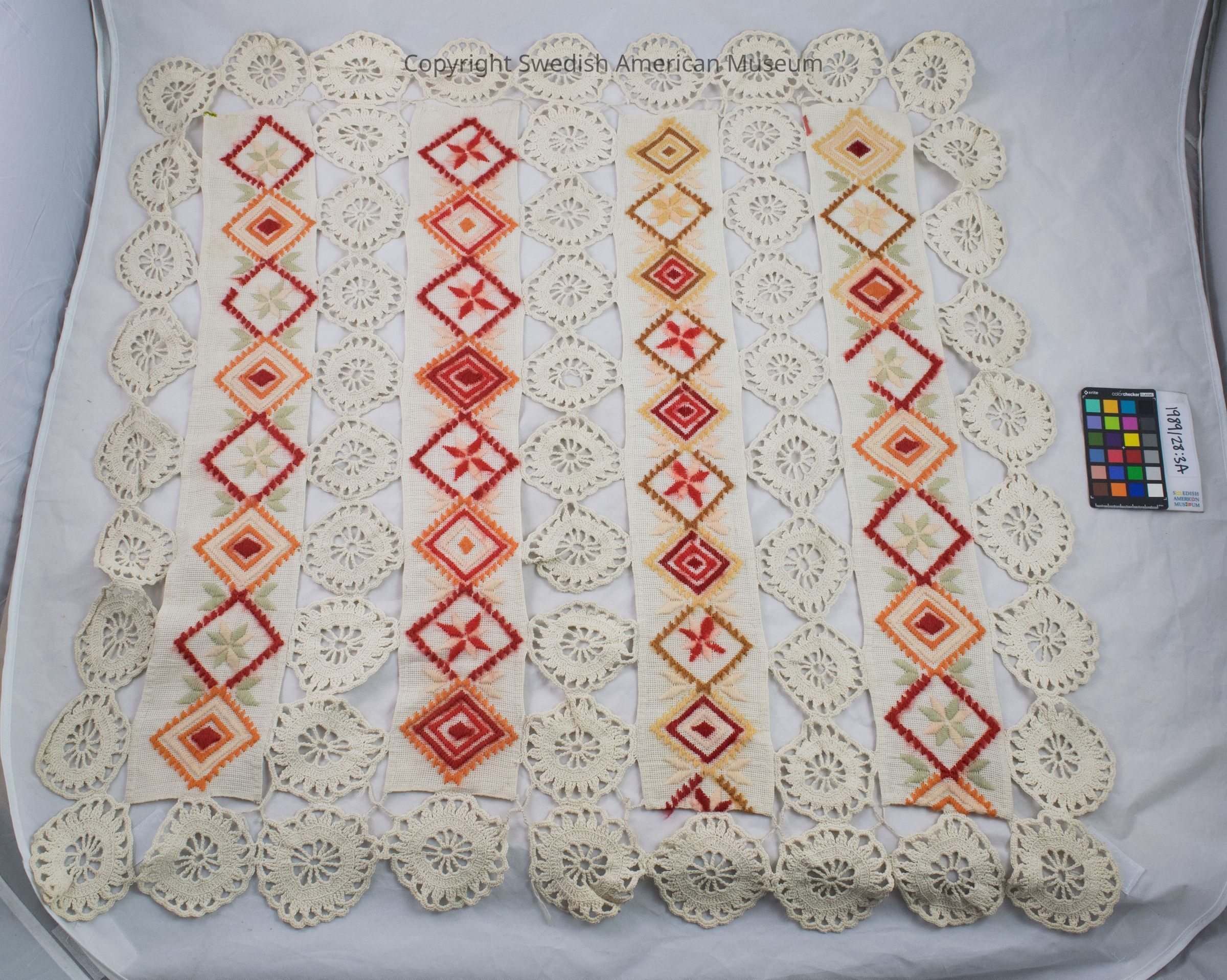 Floral pattern, linen crocheted and embroidered tablecloth.