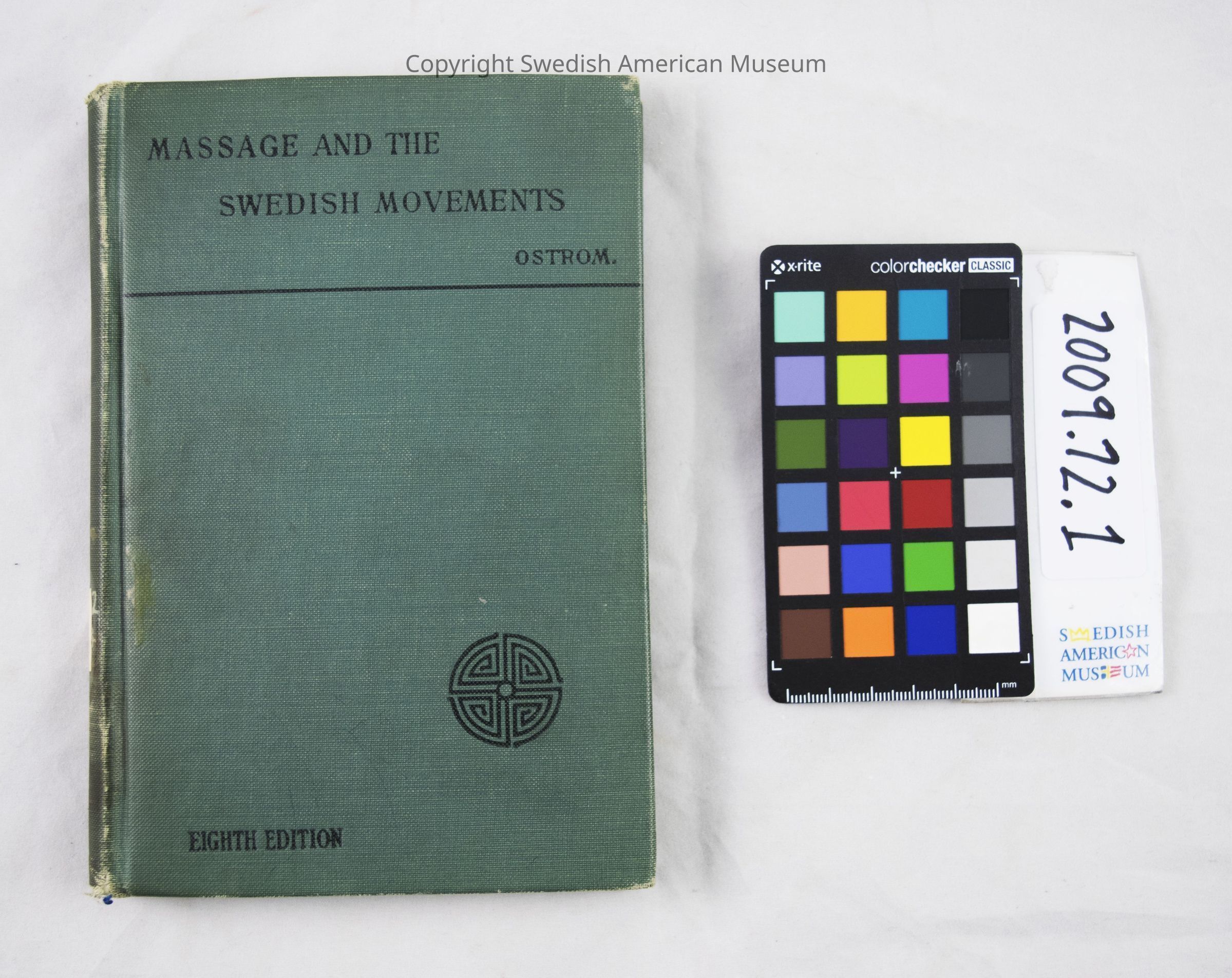 Green-colored book entitled "Massage and the Swedish Movements" by Ostrom. The book is the eighth edition, and it was once property of the Augustana Hospital School of Nursing. The copyright date is 1918. Published by P. Blakiston's Son & Co.