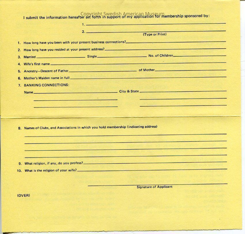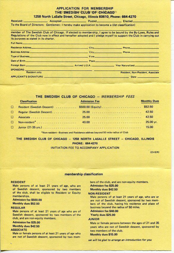 Invitation to become a member of the Swedish Club of Chicago. It includes a questionnaire and an application for membership.