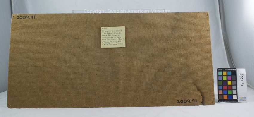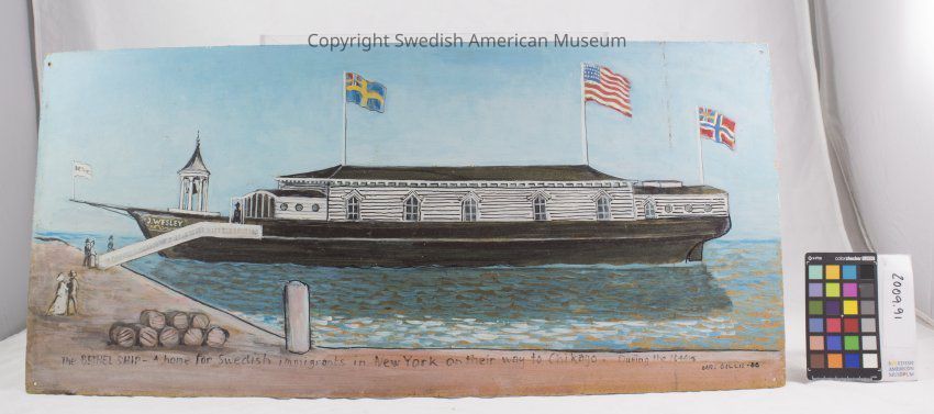 Painting of a covered boat, with a large bell in a pavilion at the prow and three flags on posts along its length, docked at a jetty, with passengers on and approaching its gangway. A white flag on the prow reads, "Bethel," and yellow lettering below it on the side reads, "J. Wesley." Inscribed along the bottom is, "The BETHEL SHIP - A home for Swedish immigrants in New York on their way to Chikago [sic]. During the 1840's," and lower, signed and dated.Type of Painting