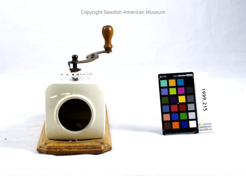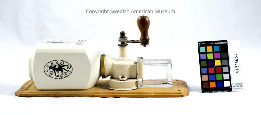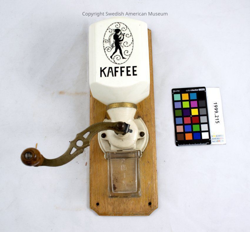 Coffee grinder mounted on a board to hang on wall. The bean container is white ceramic decorated with pictures on three sides and the word "KAFFEE" on the front.Acquisition