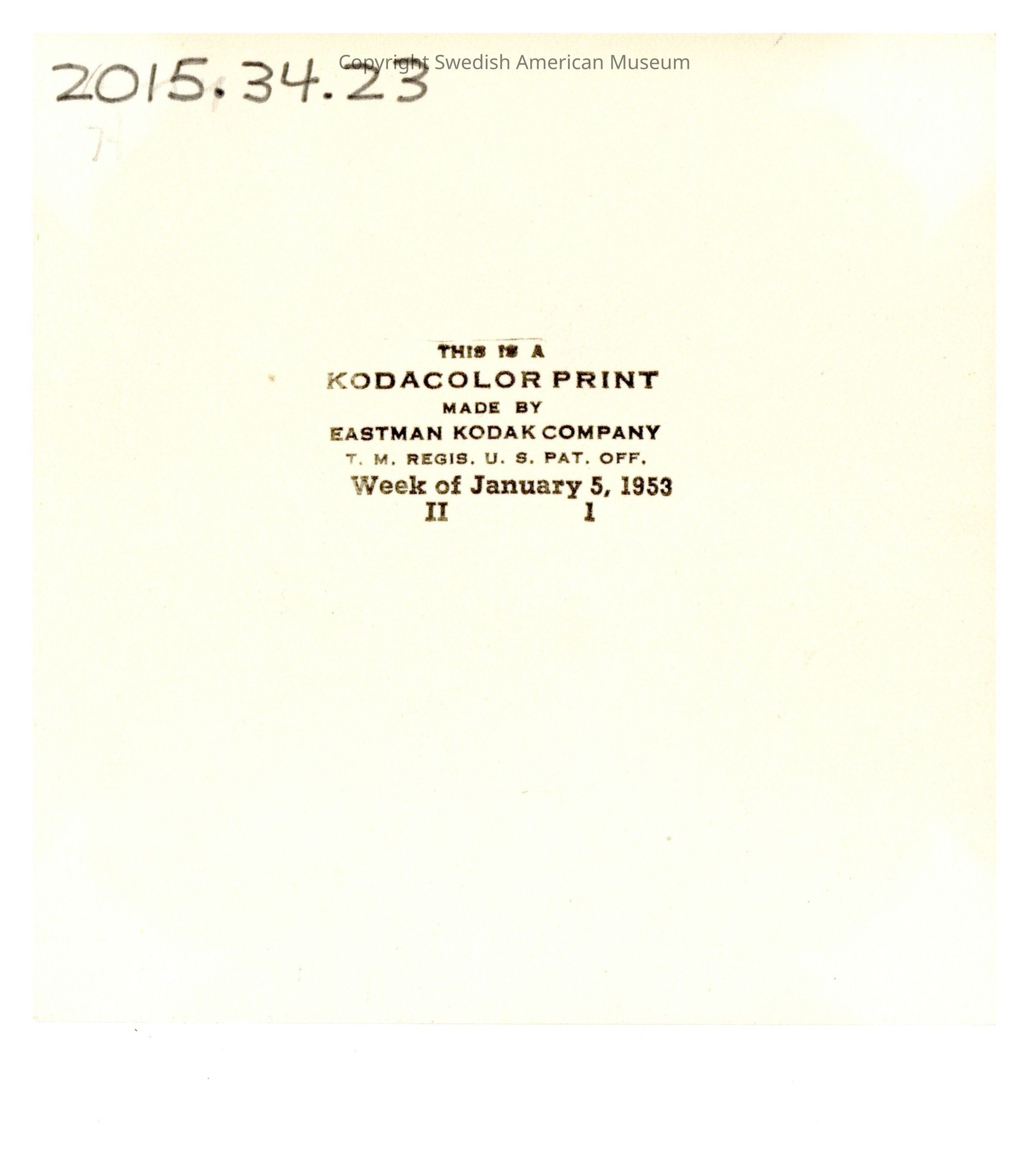 The back indicates that this photograph was processed by Kodak the week of Jan. 5, 1953. Kodacolor prints were first introduced in 1942 which dates this photograph between 1942-1953.Lexicon