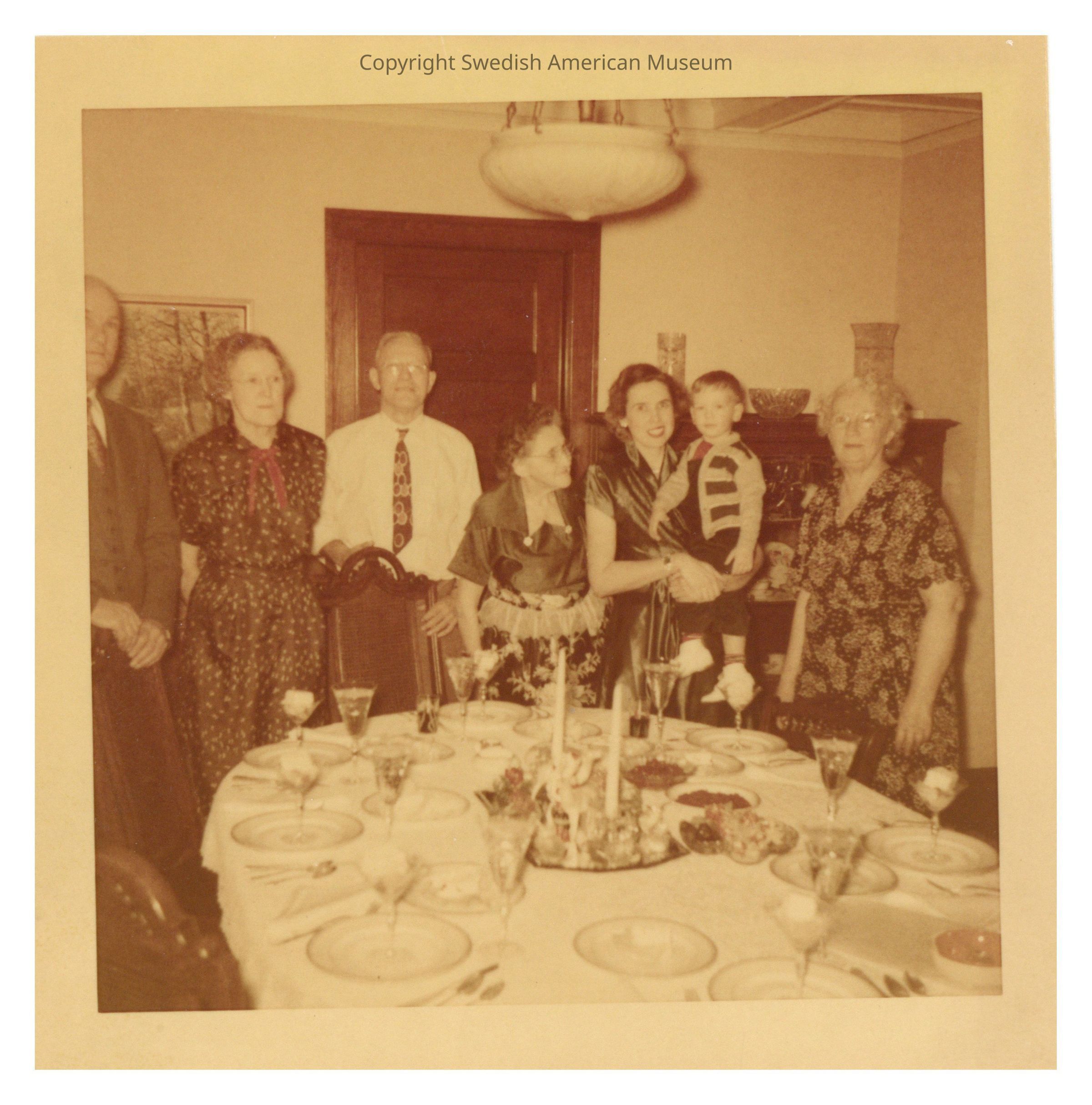 Photograph that shows four women, two men, and one little boy who are gathered around a large dining-room table.Photograph Details
