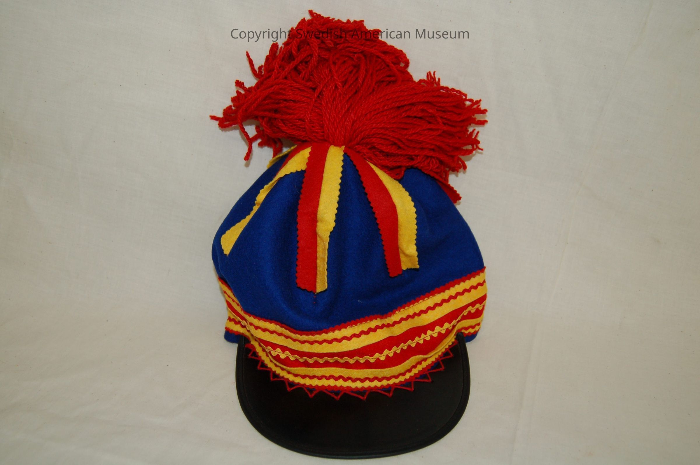 A visored Sami hat made of brilliant blue felt and decorated with red and yellow felt and rickrack. A 'visor' is the front part of a helmet which can be lifted to show the face protecting it from the brim or border of the cap. It has a large, red yarn tassel on top and a 'tassel' is an ornamental fringed knot of silk or wool. Undated.Acquisition